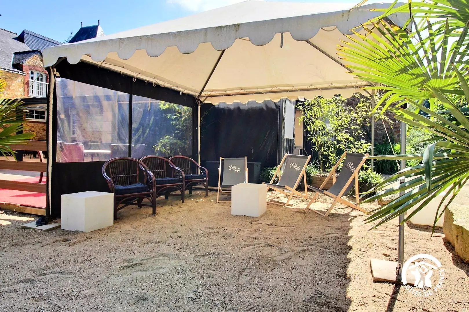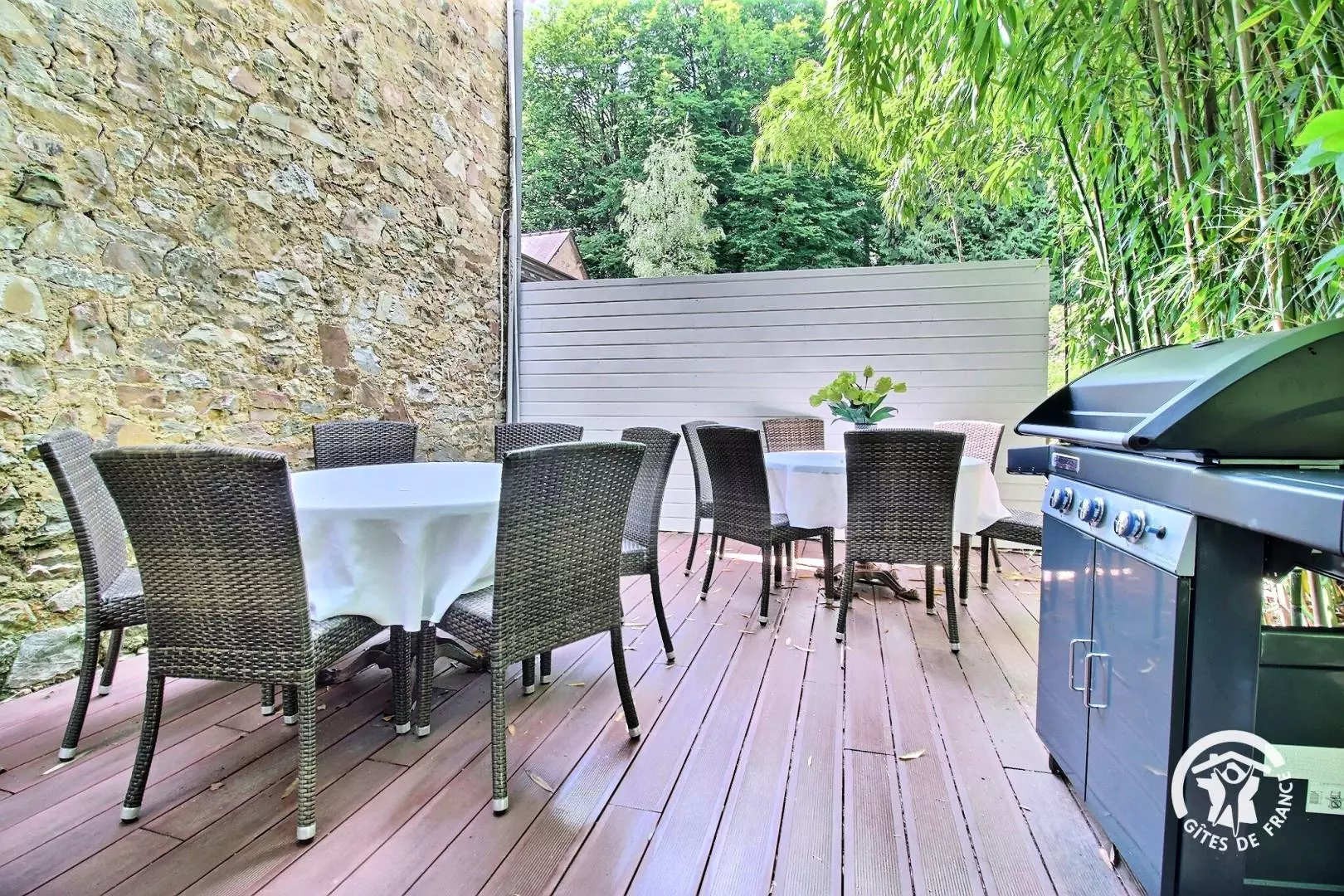Terrasse aménagée avec tables, chaises de jardin et barbecue