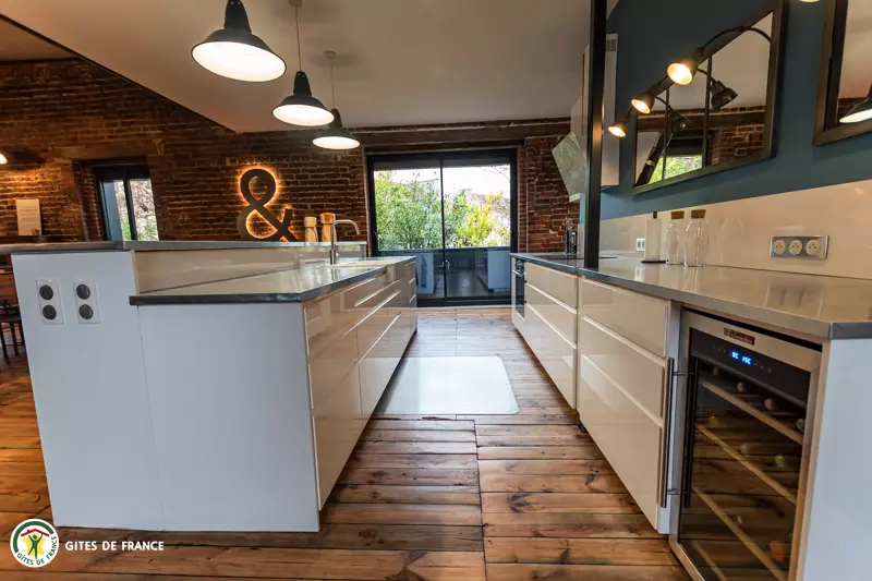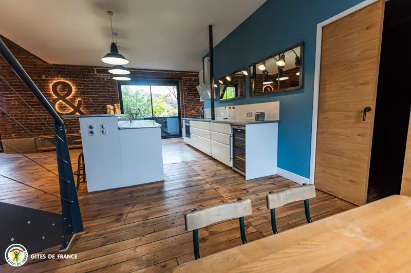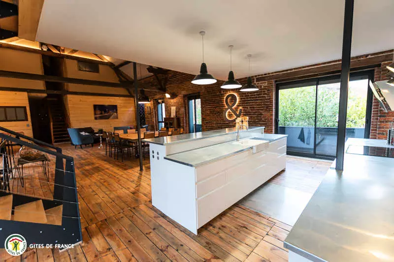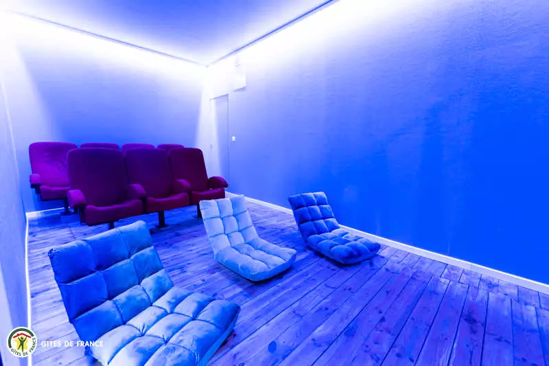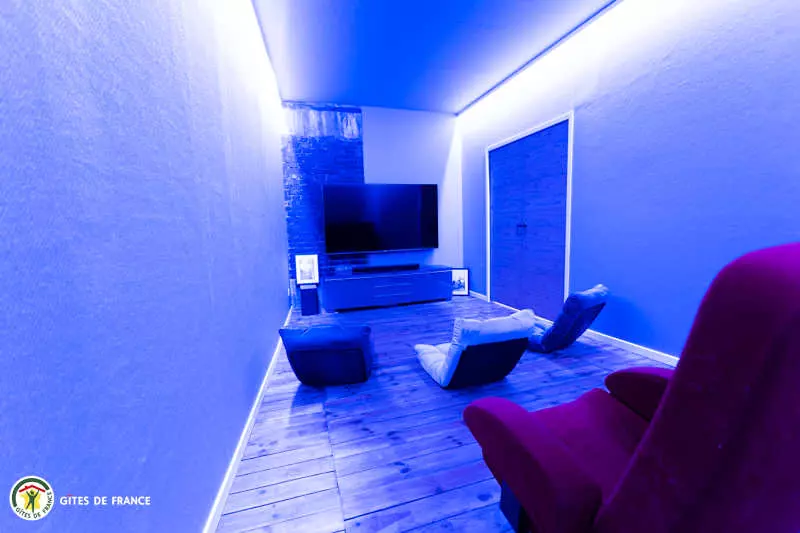 La pièce de vie + de 100 m2 avec une table pour 12 créée avec d'un plateau de pressoir, un salon, 7 m sous plafond, où vous pourrez vous détendre avec le foot sur table et la salle de cinéma attenante. La cuisine et le bar, ouverts sur la pièce de vie, sont entièrement équipés pour cuisiner et déguster avec les convives ( cafetière à poudre, jura à grain et machine à glaçon).