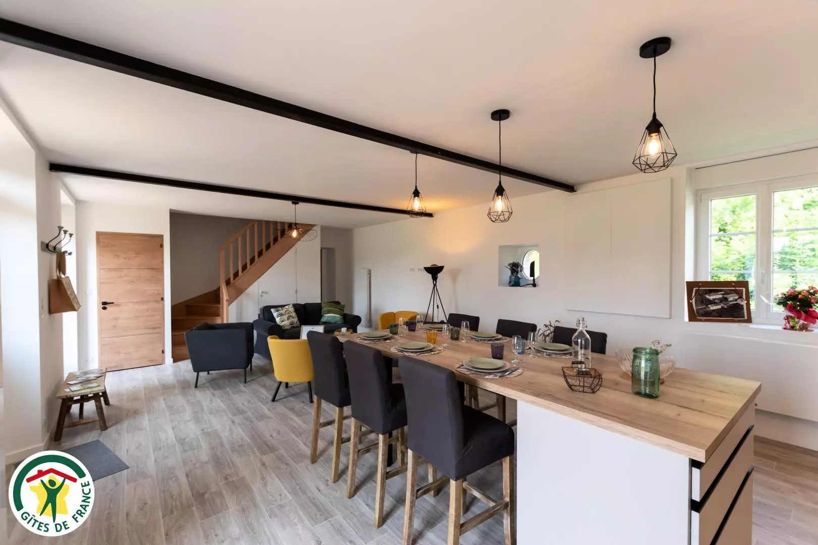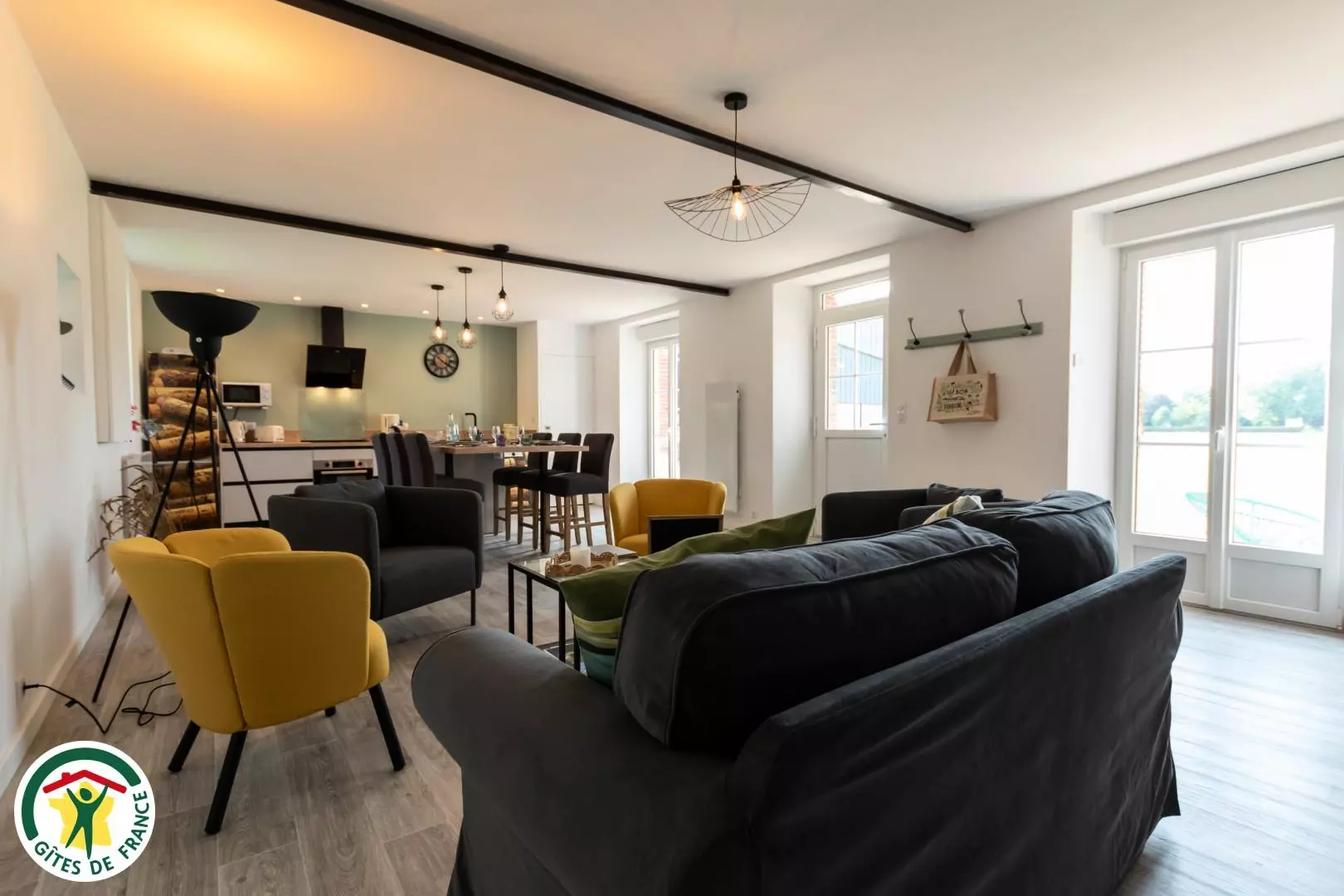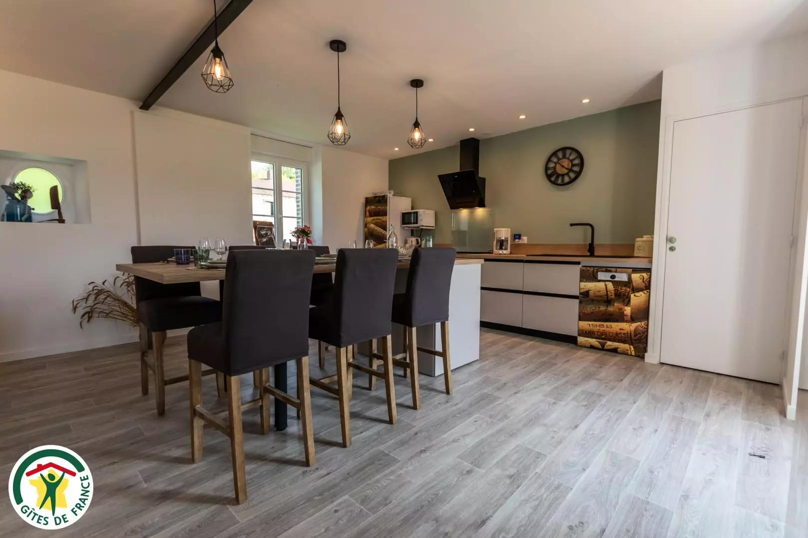 Au rez-de-chaussée, vous découvrirez une grande pièce à vie avec salon, salle à manger et cuisine, un WC indépendant et la chambre Brique (avec un lit double en 160 et une salle d'eau ouverte).