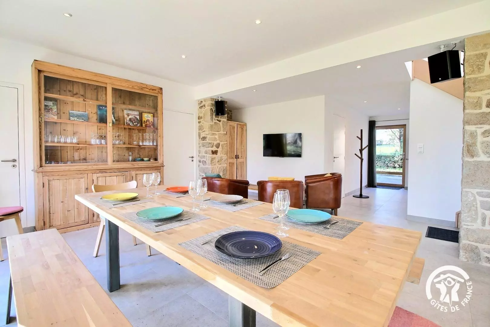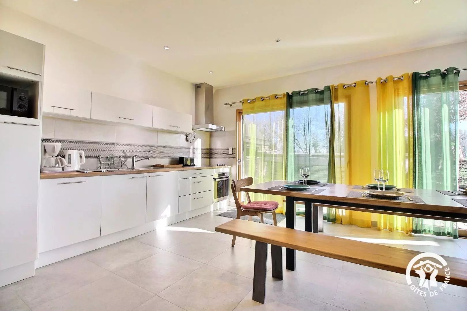 Cuisine ouverte sur le salon/séjour avec une grande table,
