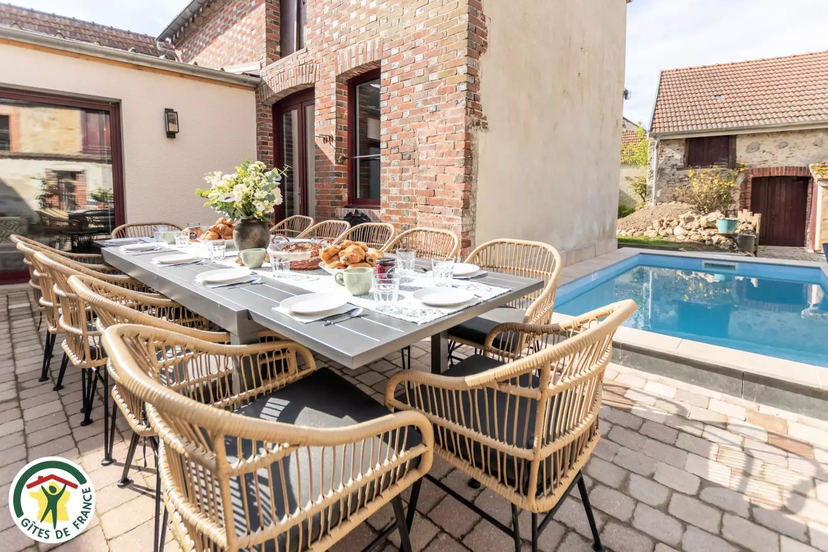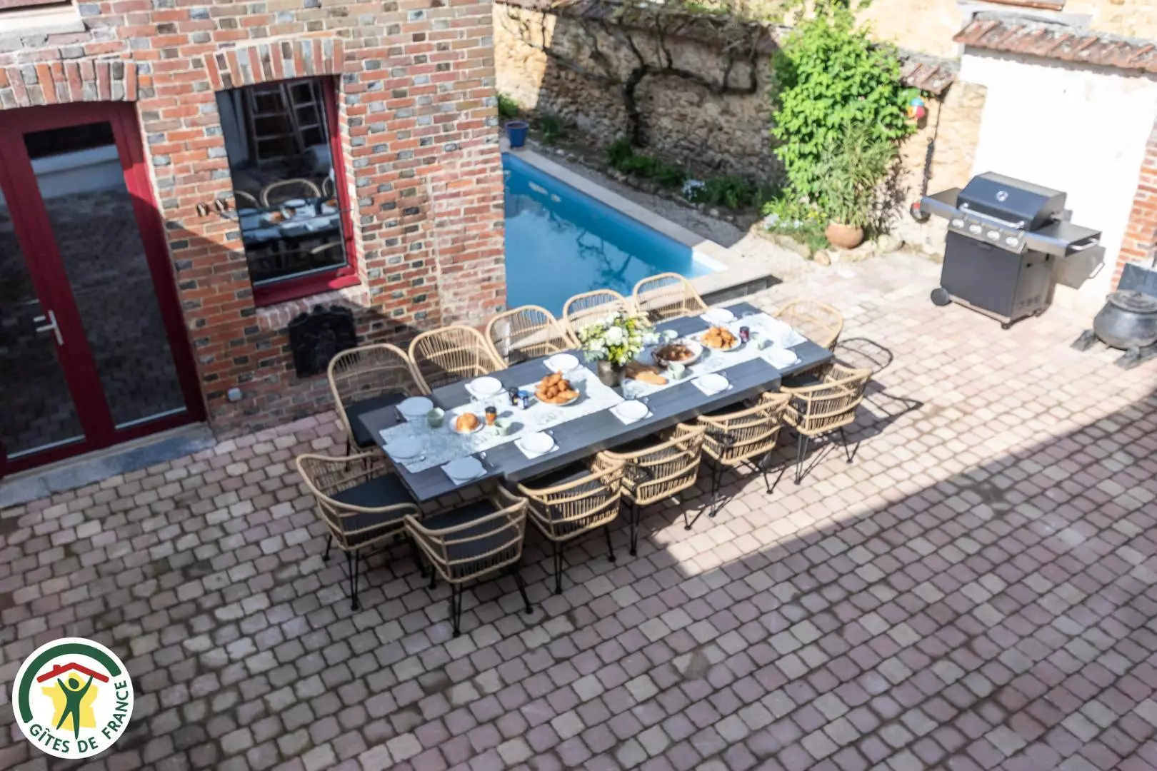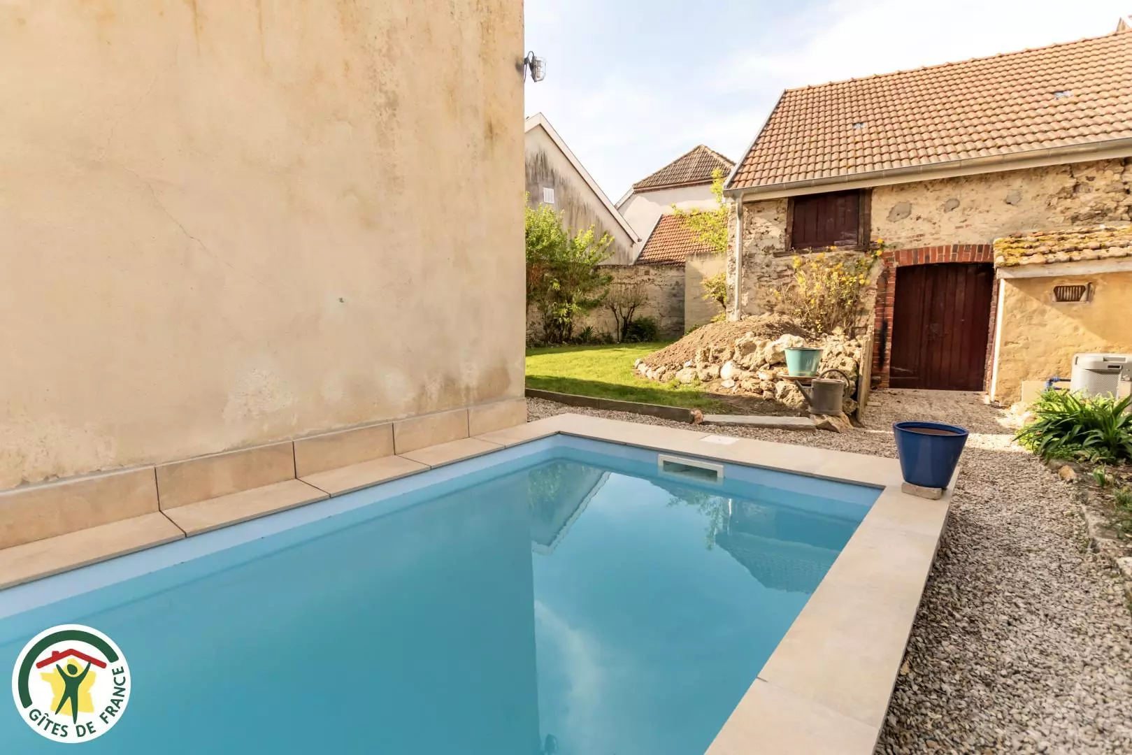 A l'extérieur (complètement clos de mur) avec une grande terrasse et une piscine extérieur (ouverte en saison) pour les beaux jours.