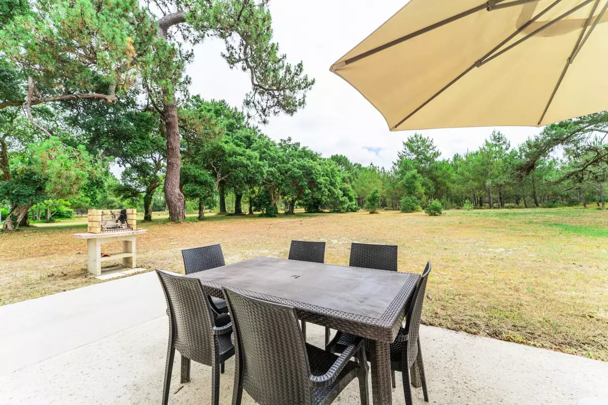 À l’extérieur, profitez d’un jardin privatif et d’une spacieuse terrasse aménagée avec table à manger, chaises longues, parasol et barbecue: un cadre idéal pour vos repas en plein air ou vos moments de détente à l’ombre des pins.