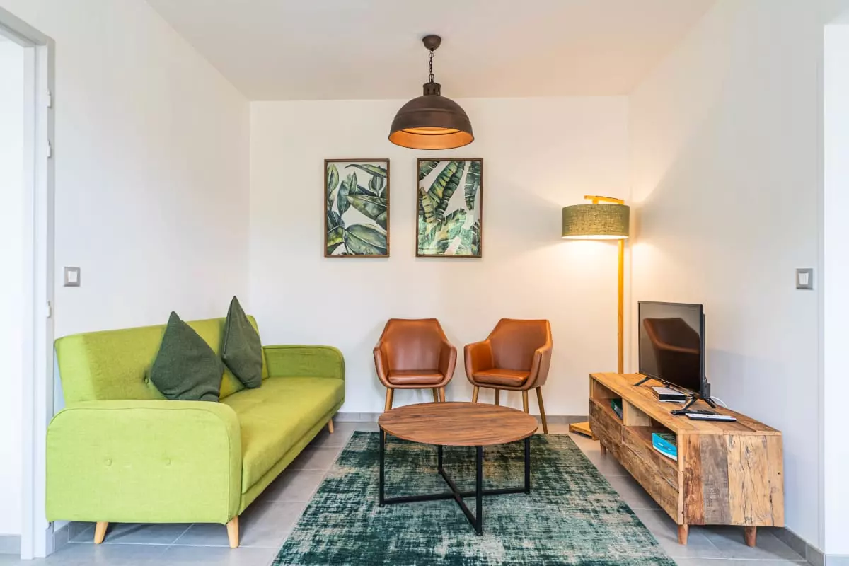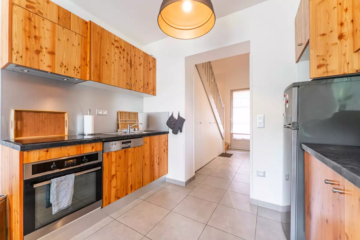 L’intérieur comprend un salon convivial, un coin repas, ainsi qu’une cuisine ouverte entièrement équipée pour préparer vos repas en toute simplicité.