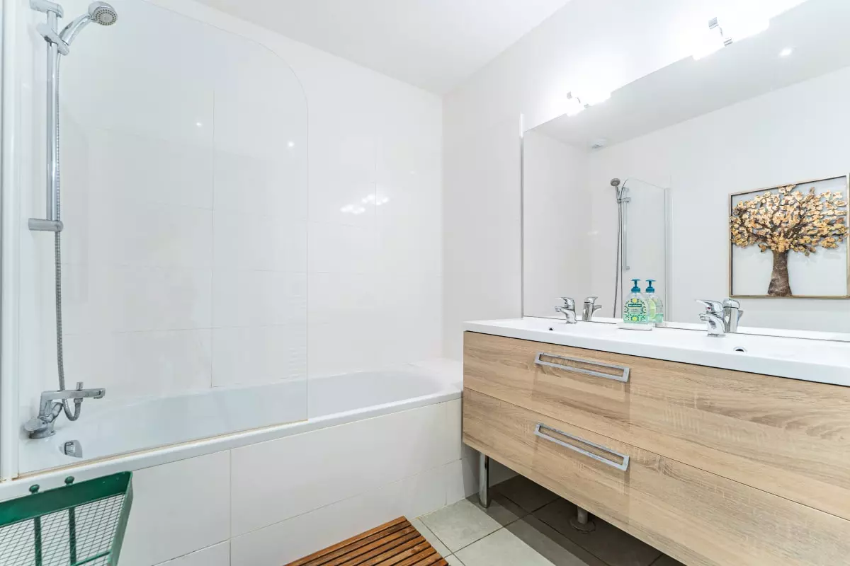 La salle de bain dispose d’une baignoire et d’un meuble double vasque, avec des toilettes séparées pour plus de confort.