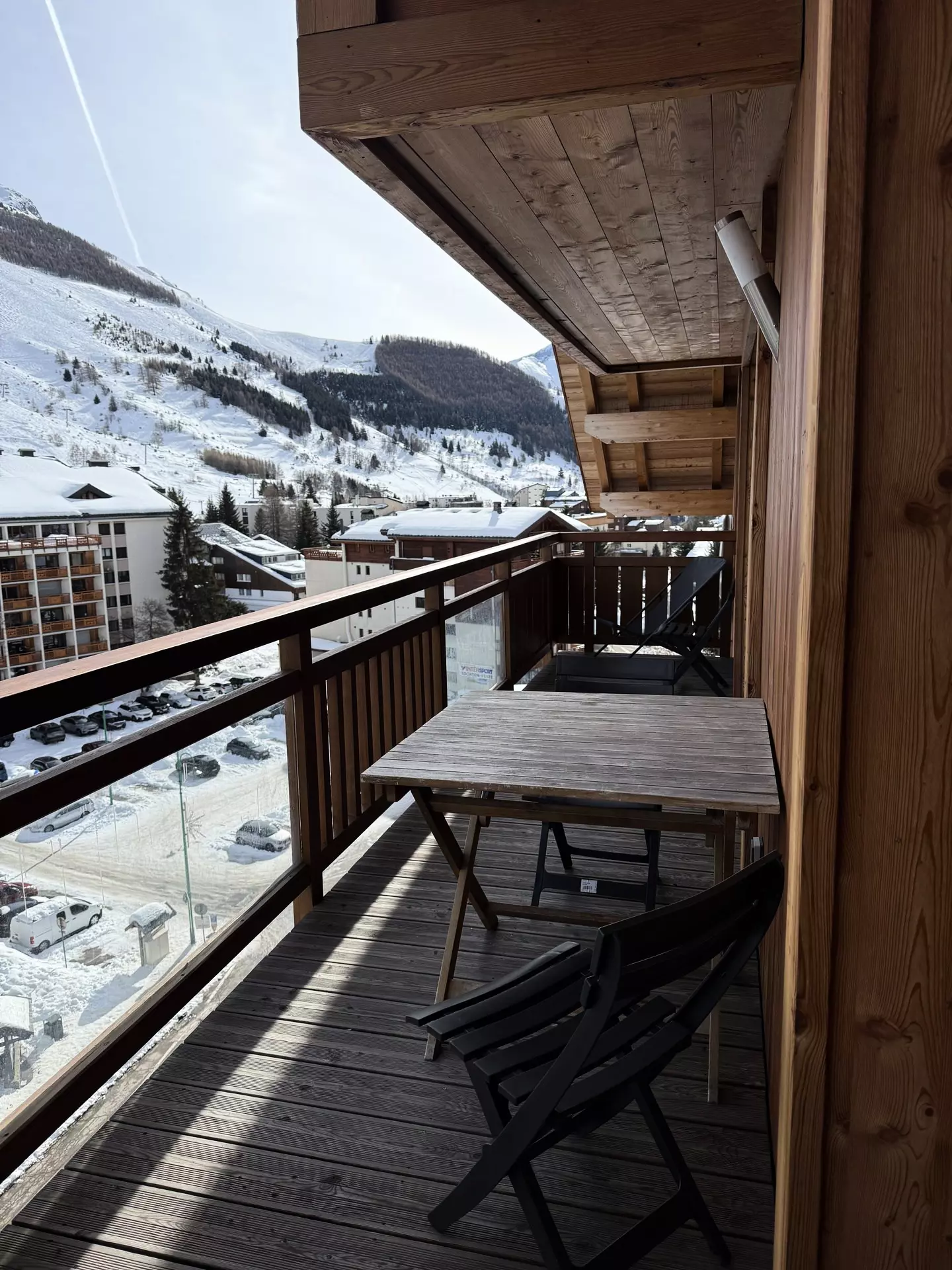 Le grand balcon Sud est mis en valeur avec un salon de terrasse en vieux bois et une table à manger extérieure.
