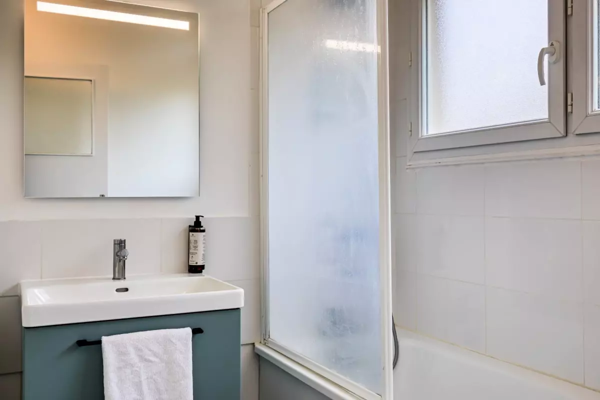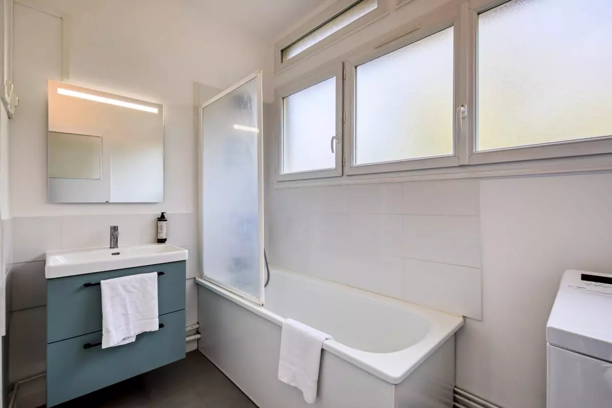 La salle de bain bénéficie d'une baignoire, d'un meuble lavabo avec miroir et d'une machine à laver le linge. Les WC sont indépendants.