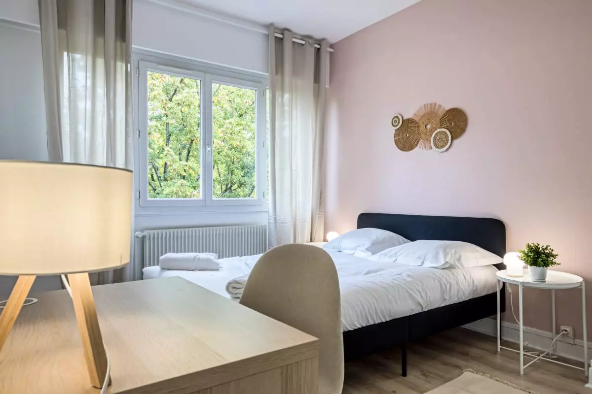 Les trois chambres vous offrent des espaces de repos agréables avec lit double et literie de qualité, et d'un espace bureau avec son assise. De grand espace de rangements sont aussi disponibles pour ranger vos affaires personnelles.