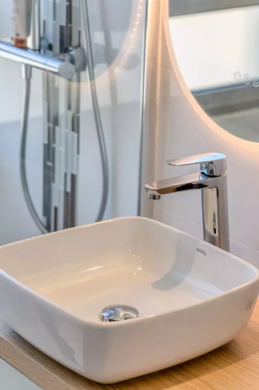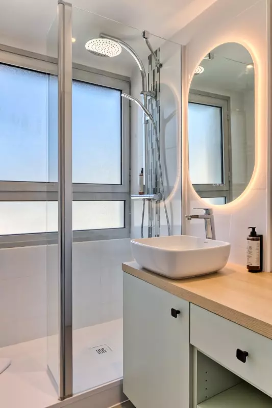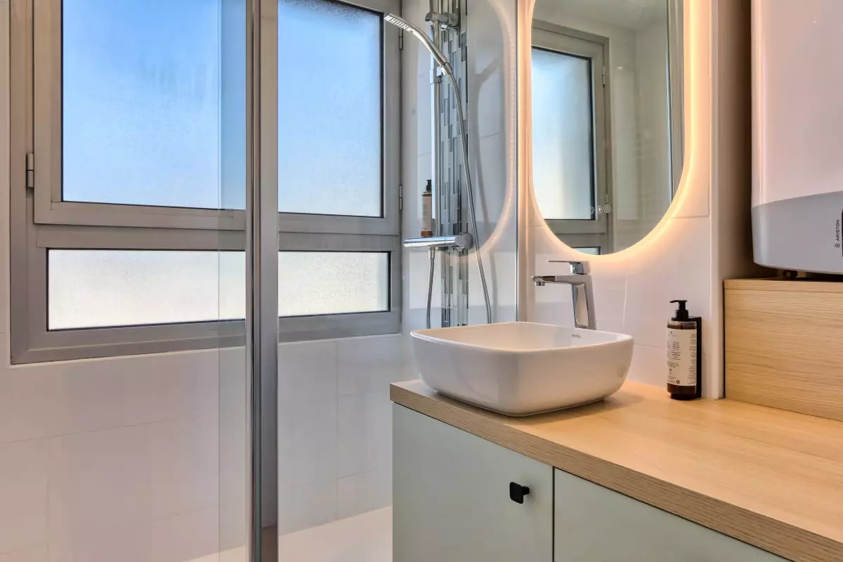 La salle de bain moderne offre une belle douche, un meuble-lavabo avec miroir, et un sèche serviette. Les WC sont indépendants.