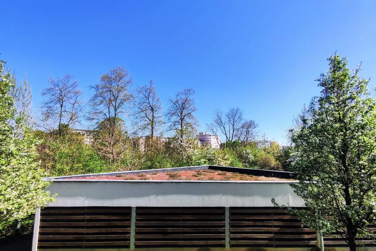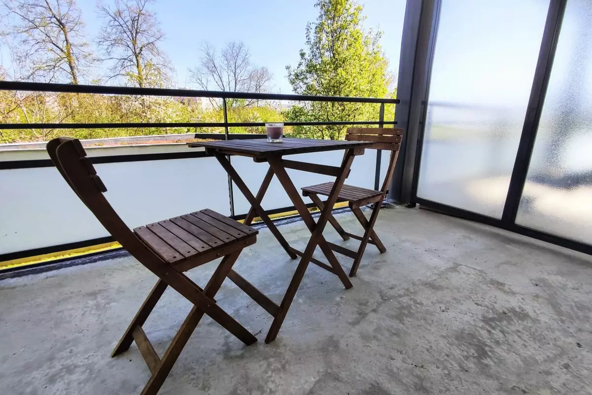 - le balcon, sans vis-à-vis, offre un cadre paisible et verdoyant pour un repas en plein air au calme.