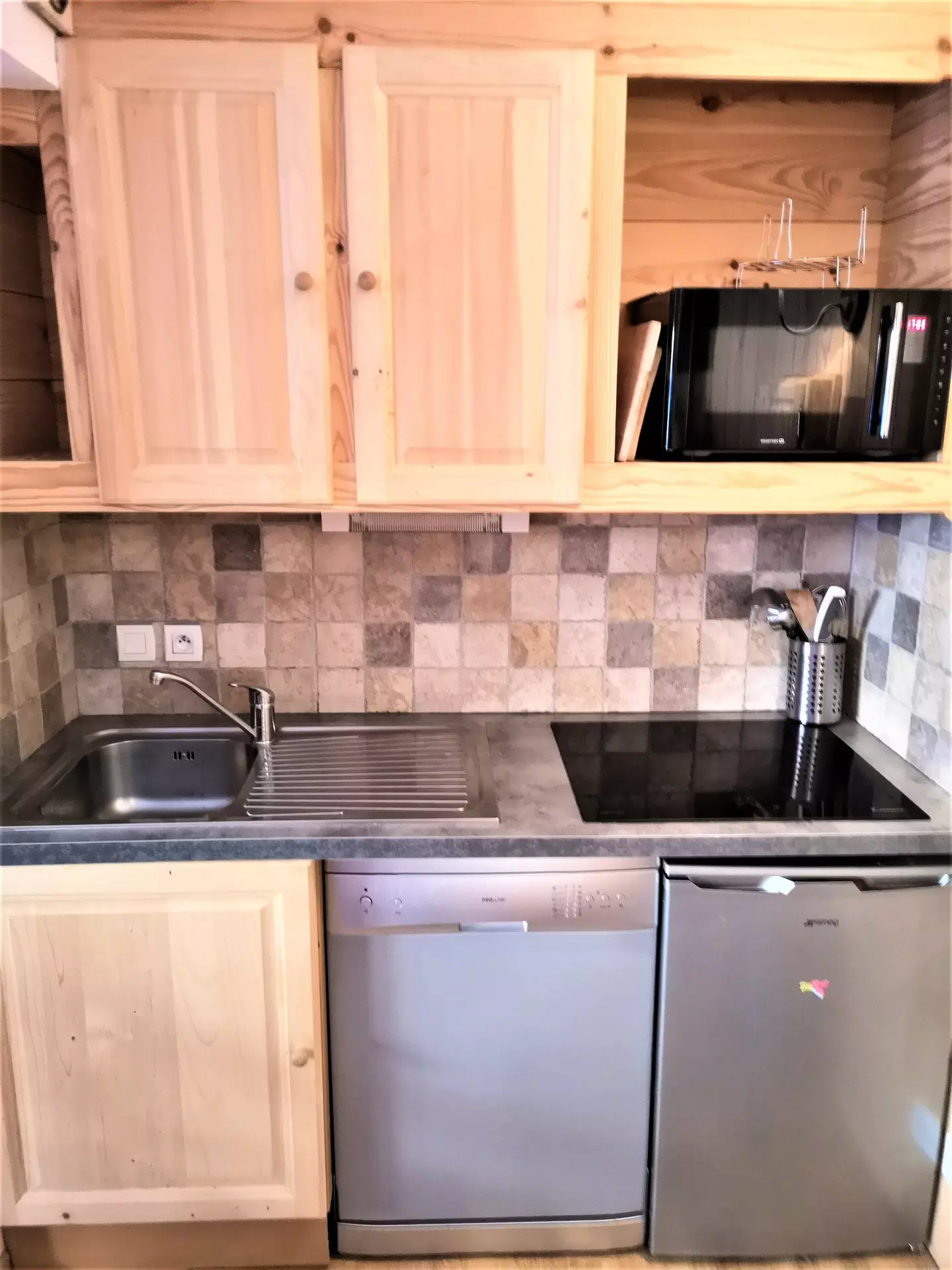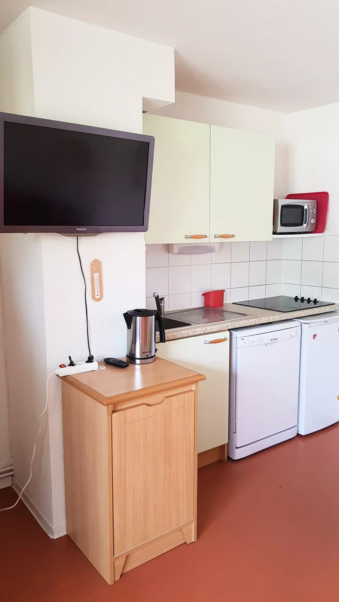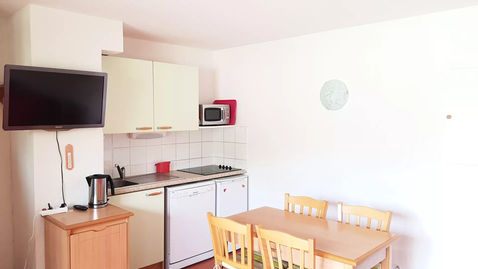 Coin cuisine équipé avec plaques vitro-céramiques, 2 réfrigérateurs, micro-ondes, lave-vaisselle, cafetière à filtre, Bouilloire, nécessaire de vaisselle. appareil a raclette; mini four