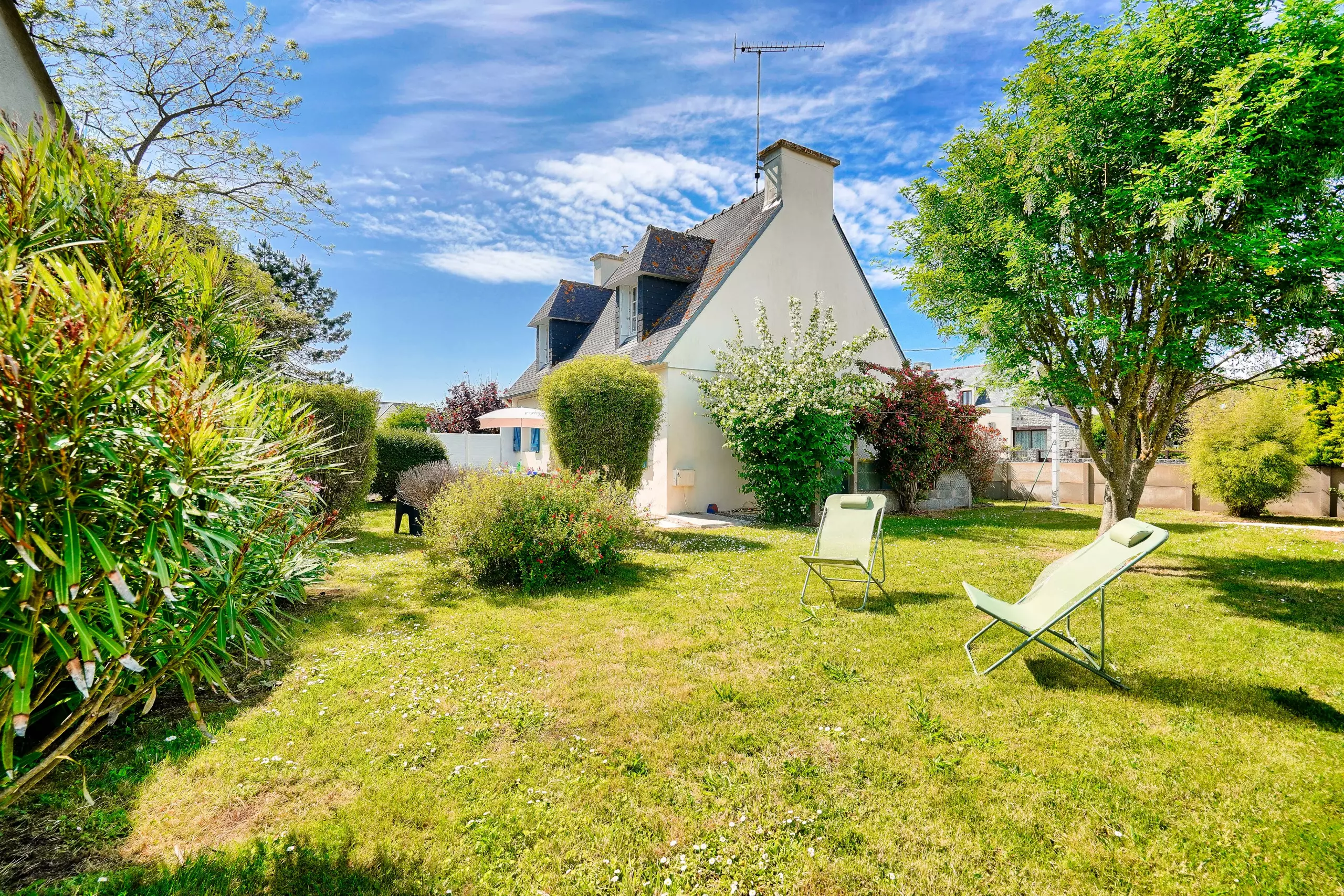 C'est une jolie maison aux couleurs douces et acidulées que nous vous proposons au Guilvinec, dans le beau pays sud bigouden. Alliant meubles anciens rénovés et décoration contemporaine, ce meublé vous séduira autant par sa décoration que par son grand jardin clôturé. Isolé des regards, il sera idéal pour les barbecues en famille et les moments de détente dans un chaise longue. Les enfants pourront y jouer en toute tranquillité.