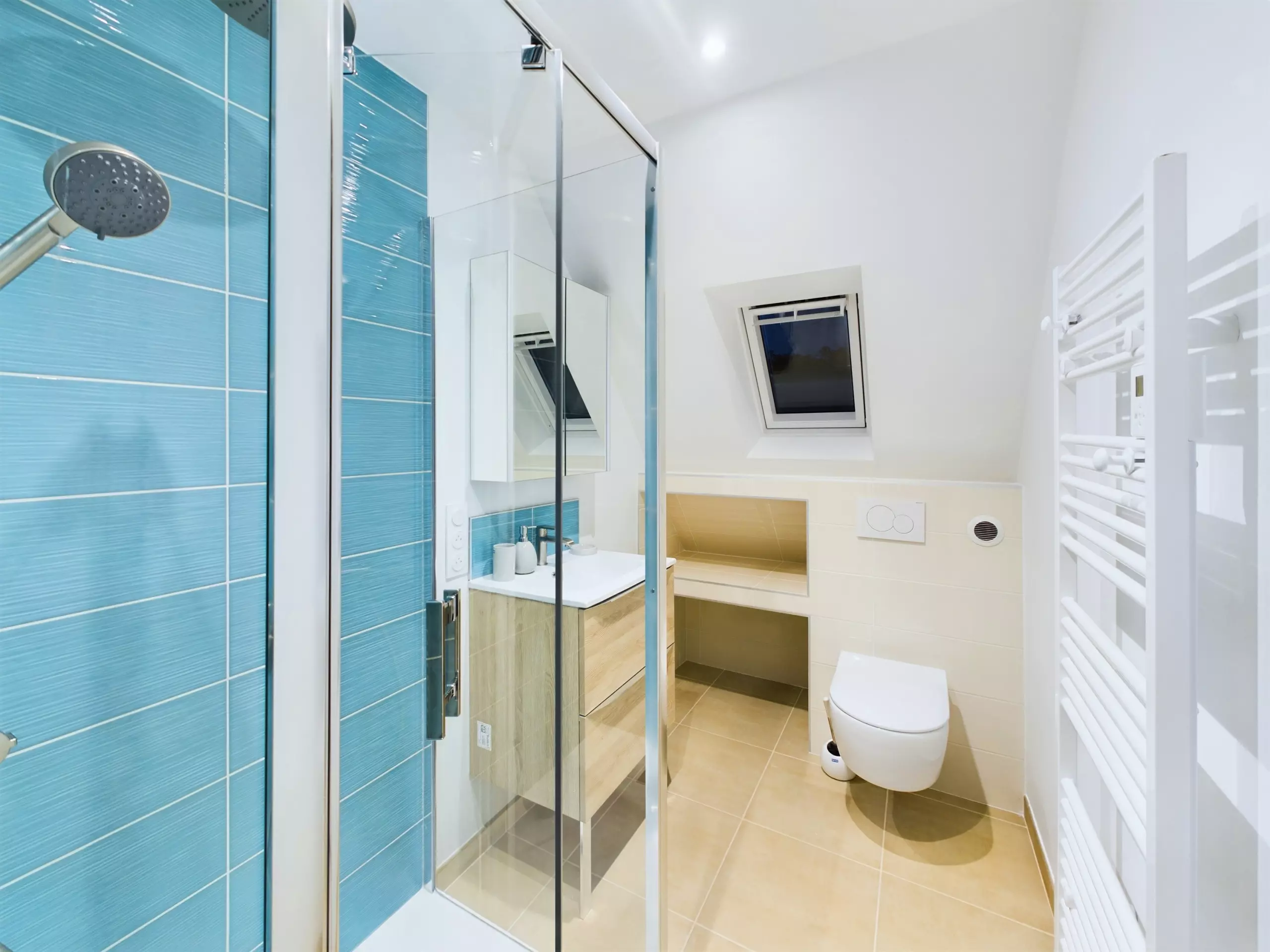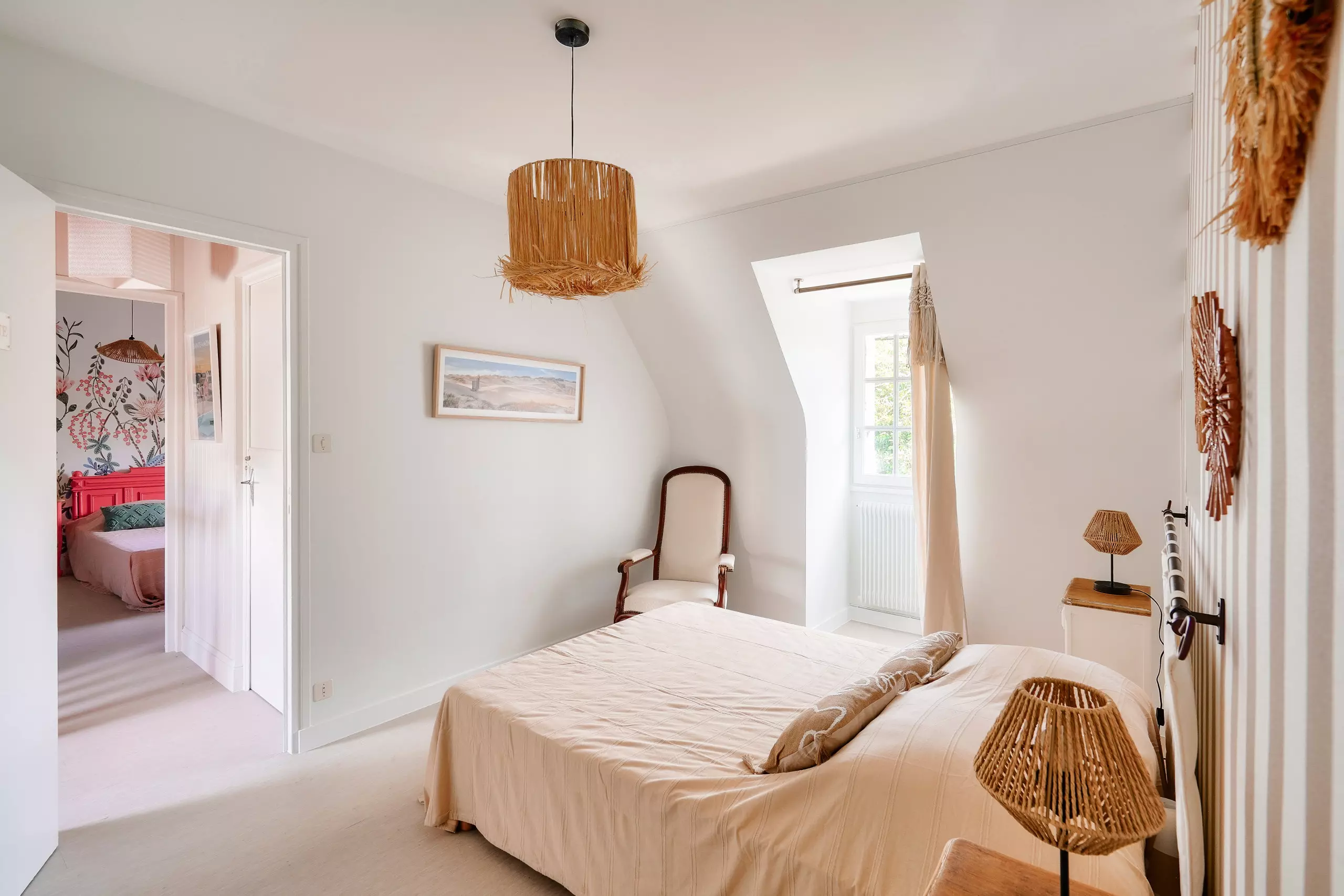 L'espace nuit se trouvent à l'étage. On y trouve trois belles chambres, toutes aussi bien décorées. La chambre "Prairie", avec son lit double, vous plonge dans une ambiance fleurie et colorée. La seconde "Nature" avec un lit double, allie le beige et le blanc à des accessoires en osier et en rotin. La troisième "Marine", avec ses deux lits simples, évoque une petite cabane sous les toits avec son lambris. Une seconde salle d'eau toute neuve avec douche vient compléter l'étage, ainsi qu'un second WC.