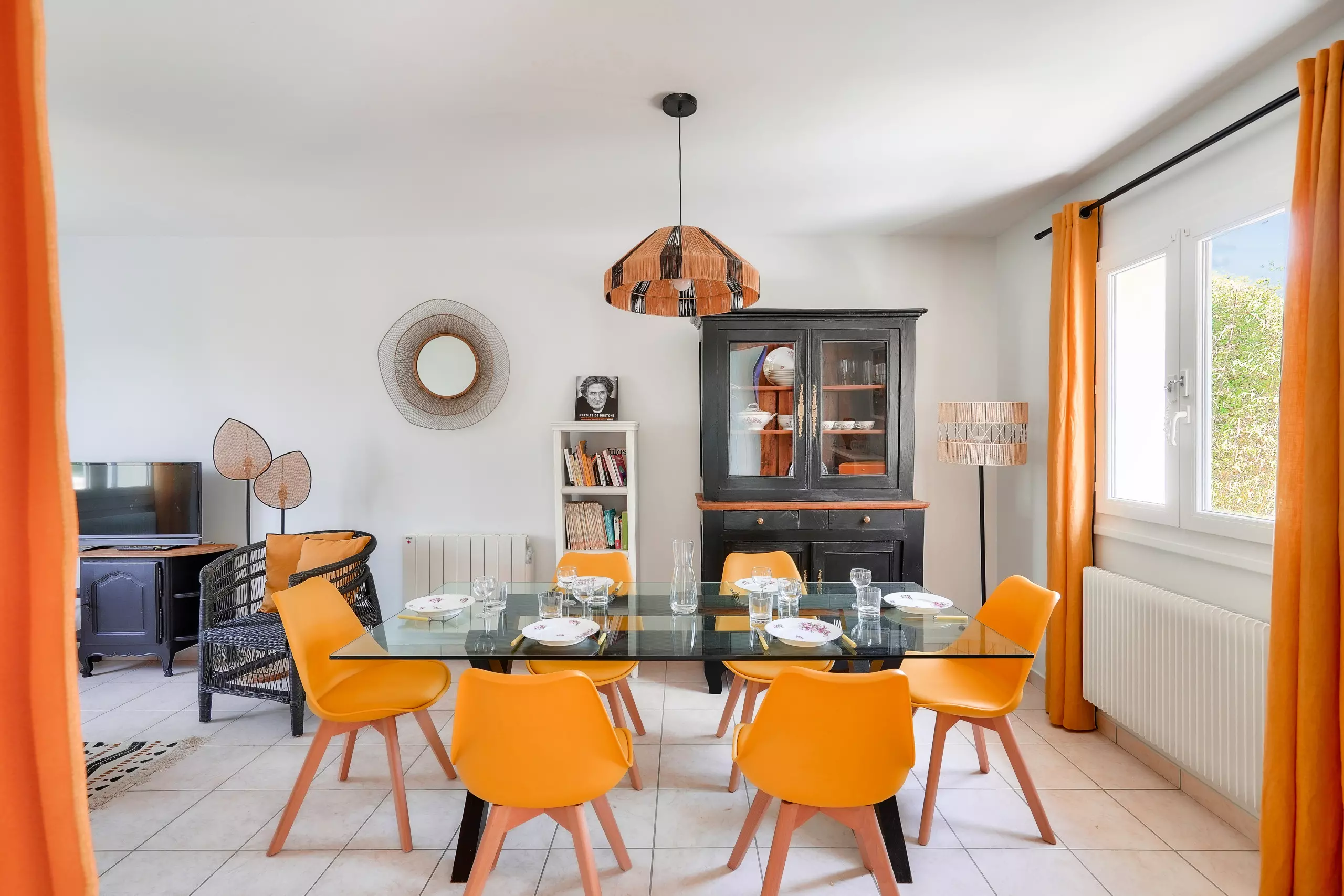 La cuisine est indépendante avec cuisson au gaz, fours traditionnel et micro-ondes pour cuisiner de bons petits plats. Un réfrigérateur et un lave-vaisselle sont également mis à votre disposition. Pour les petits déjeuners, une cafetière Senséo, un grille-pain et une bouilloire sont disponibles. Il y a une petite table pour quatre dans la cuisine, et une belle table en verre pour six dans la salle à manger, avec ses belles chaises Safran et en bois, qui donnent envie de s'asseoir autour d'un savoureux repas. Le coin salon-TV, avec ses meubles gris anthracite et ses touches déco orange, invite à la détente avec un bon livre ou un film. Un WC indépendant et une salle d'eau avec douche terminent les pièces du rez de chaussée.