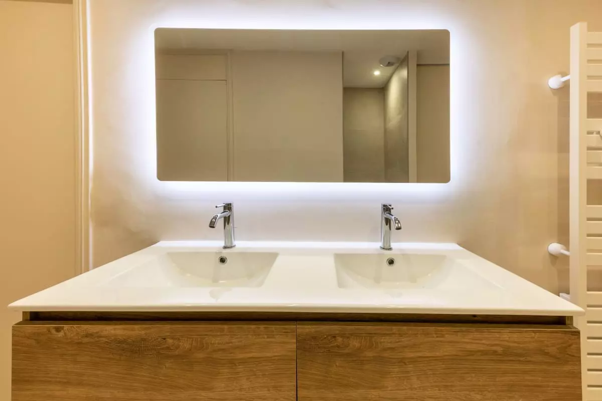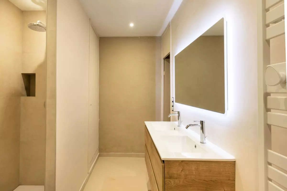 • Salle de bain de la chambre parentale rénovée avec baignoire îlot, douche à l’italienne et miroir rétroéclairé