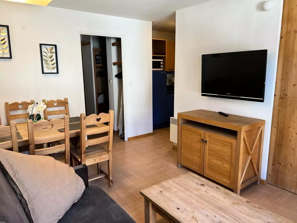 L'appartement se compose d'une entrée avec rangement, un coin nuit en rentrant sur la droite, un séjour - salle à manger avec canapé convertible et télévision, une cuisine équipée, une salle de bain avec baignoire, WC séparé, et d'un balcon avec salon de jardin pour surveiller vos enfants (ou vos amis) sur les pistes, en dégustant votre café.