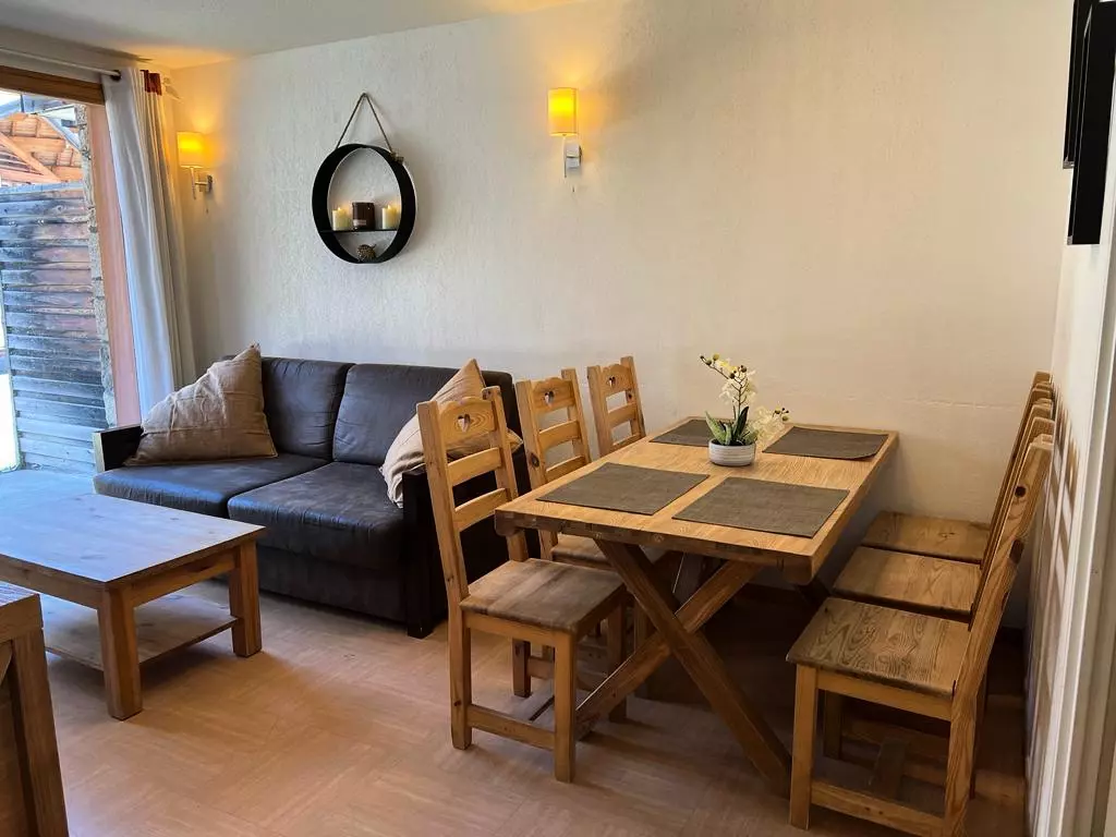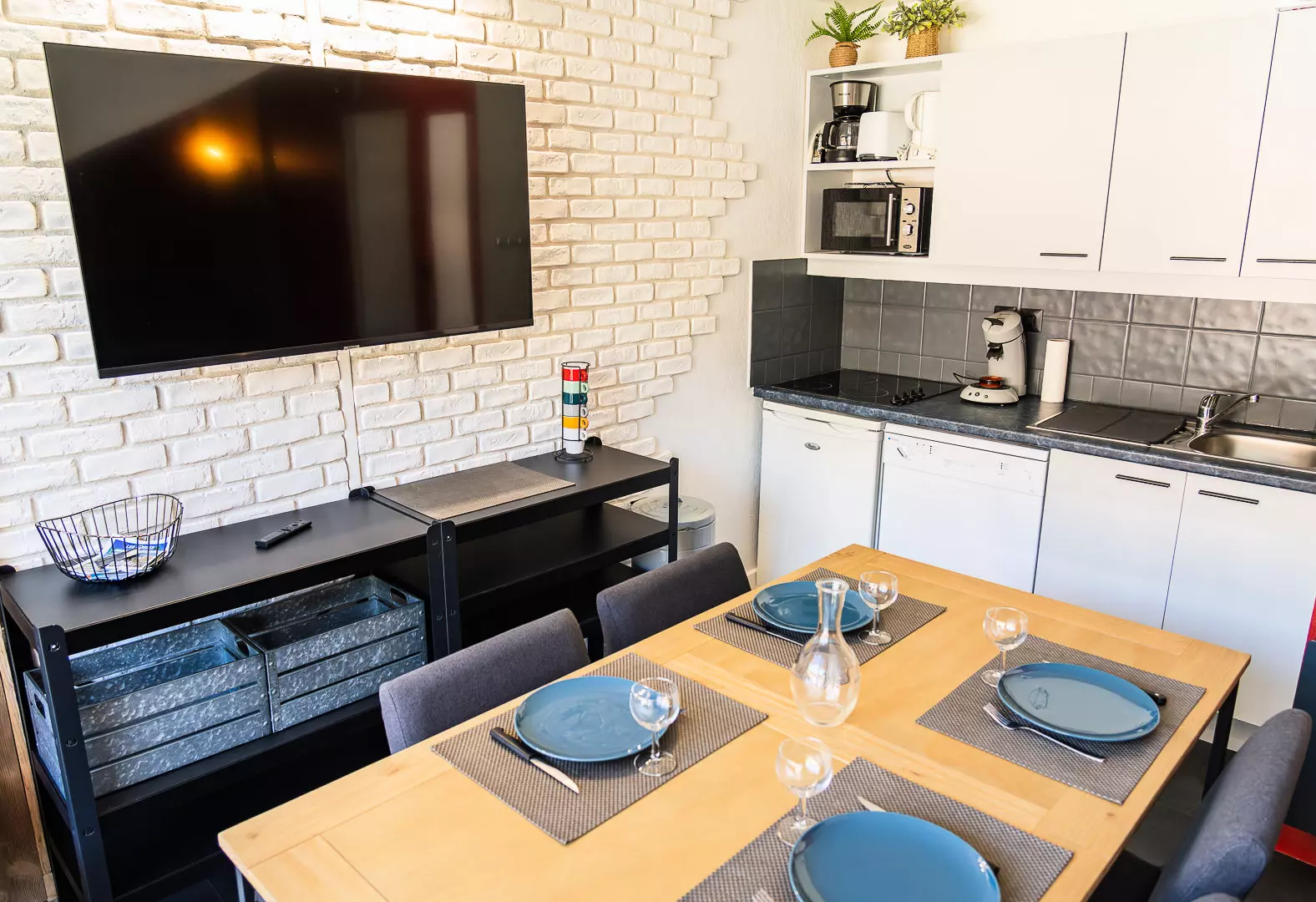 La pièce de vie se compose d'un coin salon avec canapé et d'une cuisine très bien équipée avec four, lave-vaisselle, micro-ondes, plaque de cuisson, réfrigérateur, appareil à raclette... La table à manger peut accueillir 7 convives pour partager des spécialités montagnardes avec ceux que vous aimez.