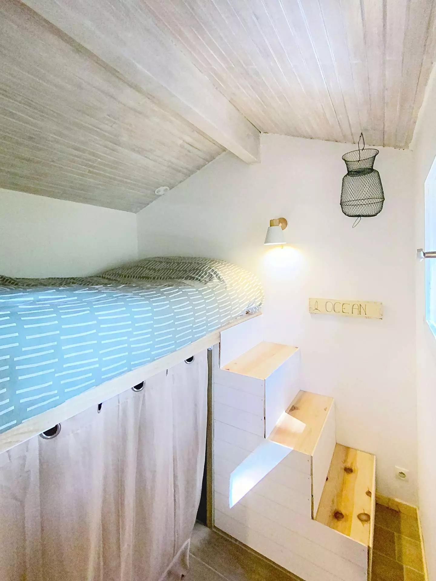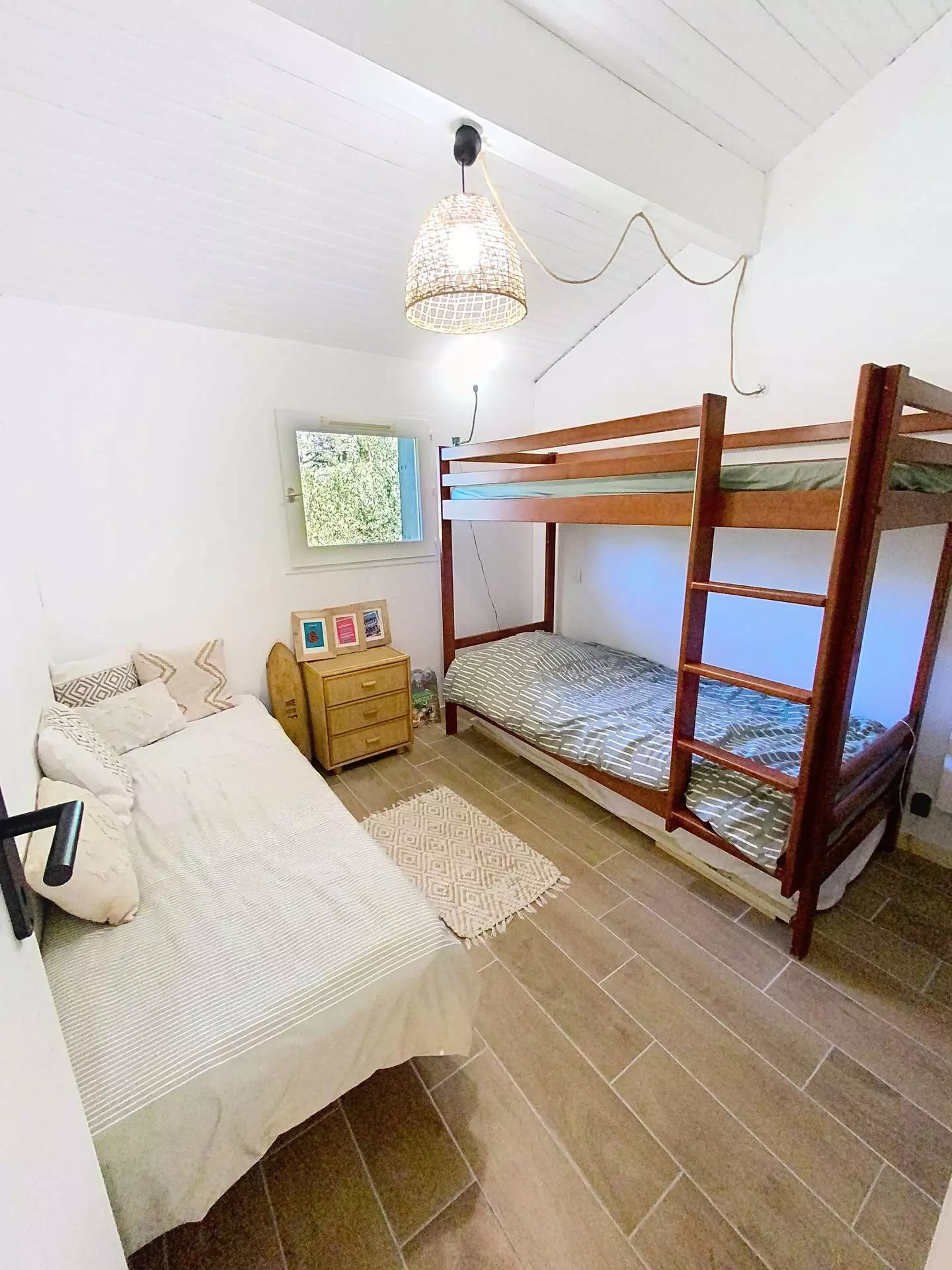 A l'entrée une cuisine indépendante entièrement équipée. En contre bas le salon salle à manger donnant sur une terrasse ombragée. Les couchages sont répartis sur 2 autres niveaux, une chambre avec lit double en 160cm, la deuxième est équipée de 3 lits simples dont 2 superposés, la troisième chambre d' un lit double en 140cm.