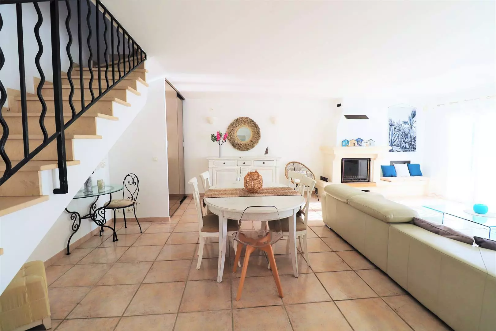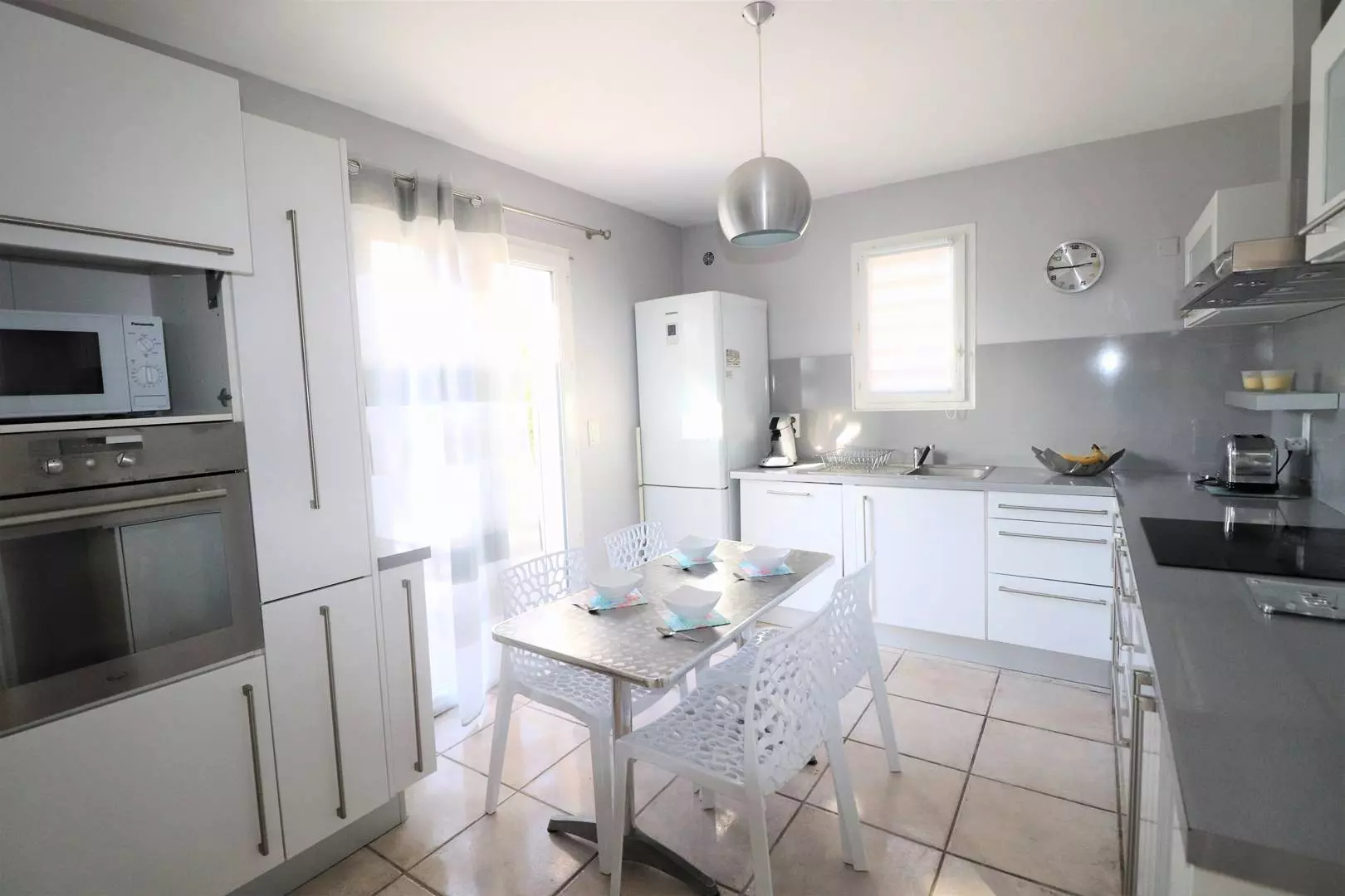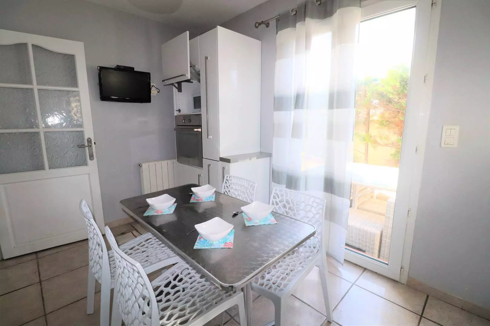 - Entrée et cuisine équipée (lave-vaisselle, four, micro-ondes, plaques vitrocéramiques) donnant sur la terrasse aménagée avec espace repas extérieur