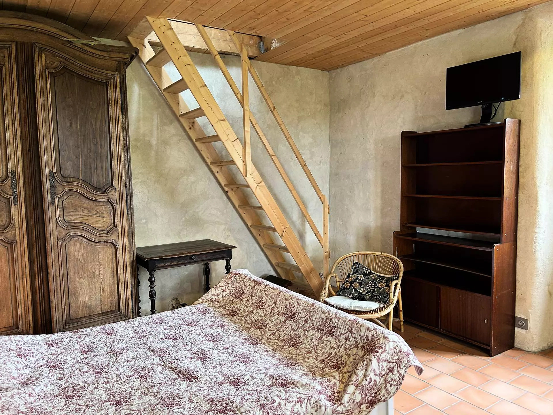 - Une chambre équipée d'un lit double (160x200cm) avec couette et oreillers et mezzanine équipée d'un couchage convertible double (140x190cm) ;