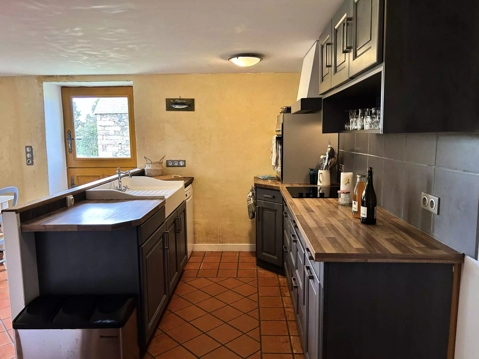 - Une cuisine fermée avec : évier, four, réfrigérateur-congélateur, plaques à induction ' feux, hotte, lave-vaisselle, micro-ondes, cafetière filtre, cafetière Nespresso, blender, bouilloire, grille pain et divers autres accessoires (presse-agrumes, râpe, planche à découper, ustensiles) ;