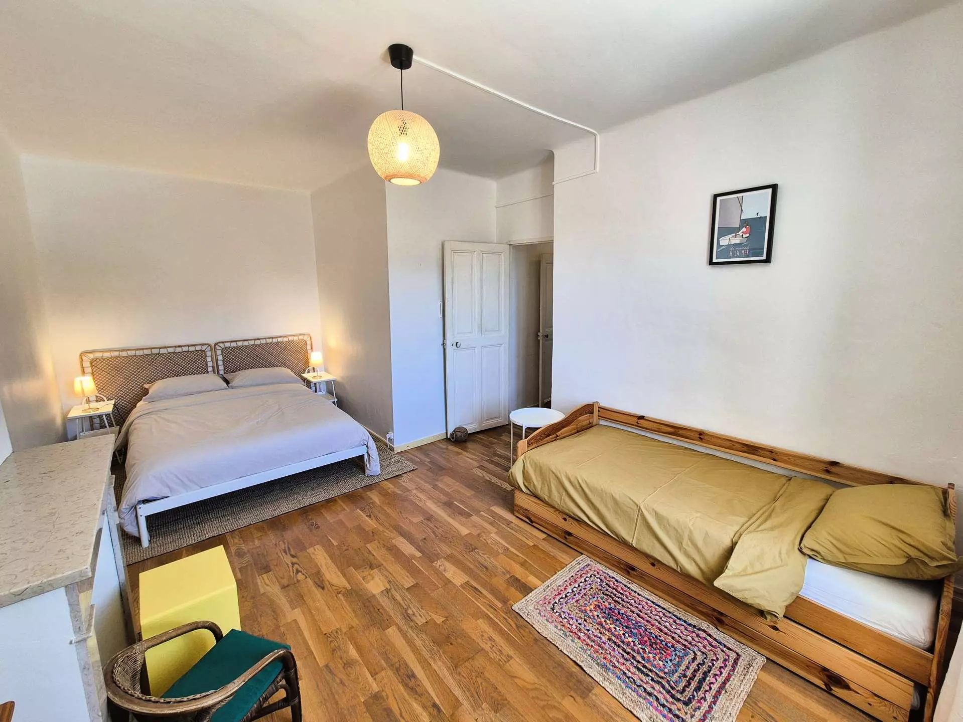 Au même niveau, vous trouverez une grande chambre climatisé avec un lit double et un lit gigogne, ainsi qu'une belle salle de bain avec baignoire et un WC séparé.