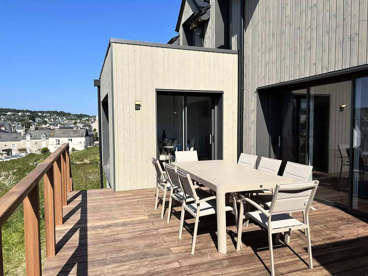 Spacieuse, orientée Ouest et enrichie d'une terrasse avec vue sur la mer et la baie d'Erquy, elle peut accueillir jusqu'à 12 voyageurs.