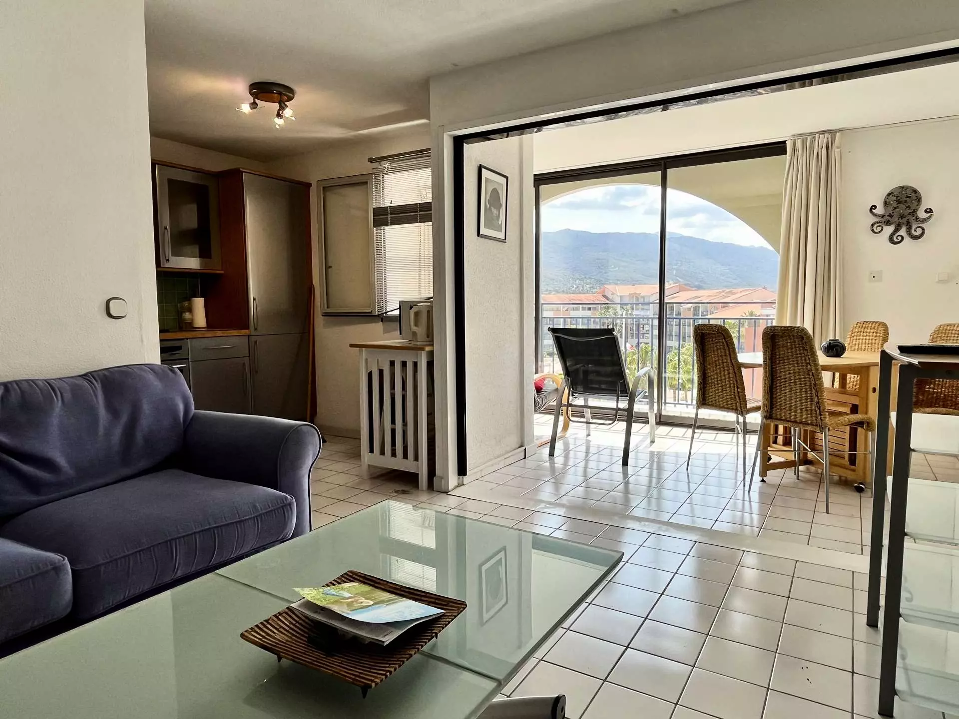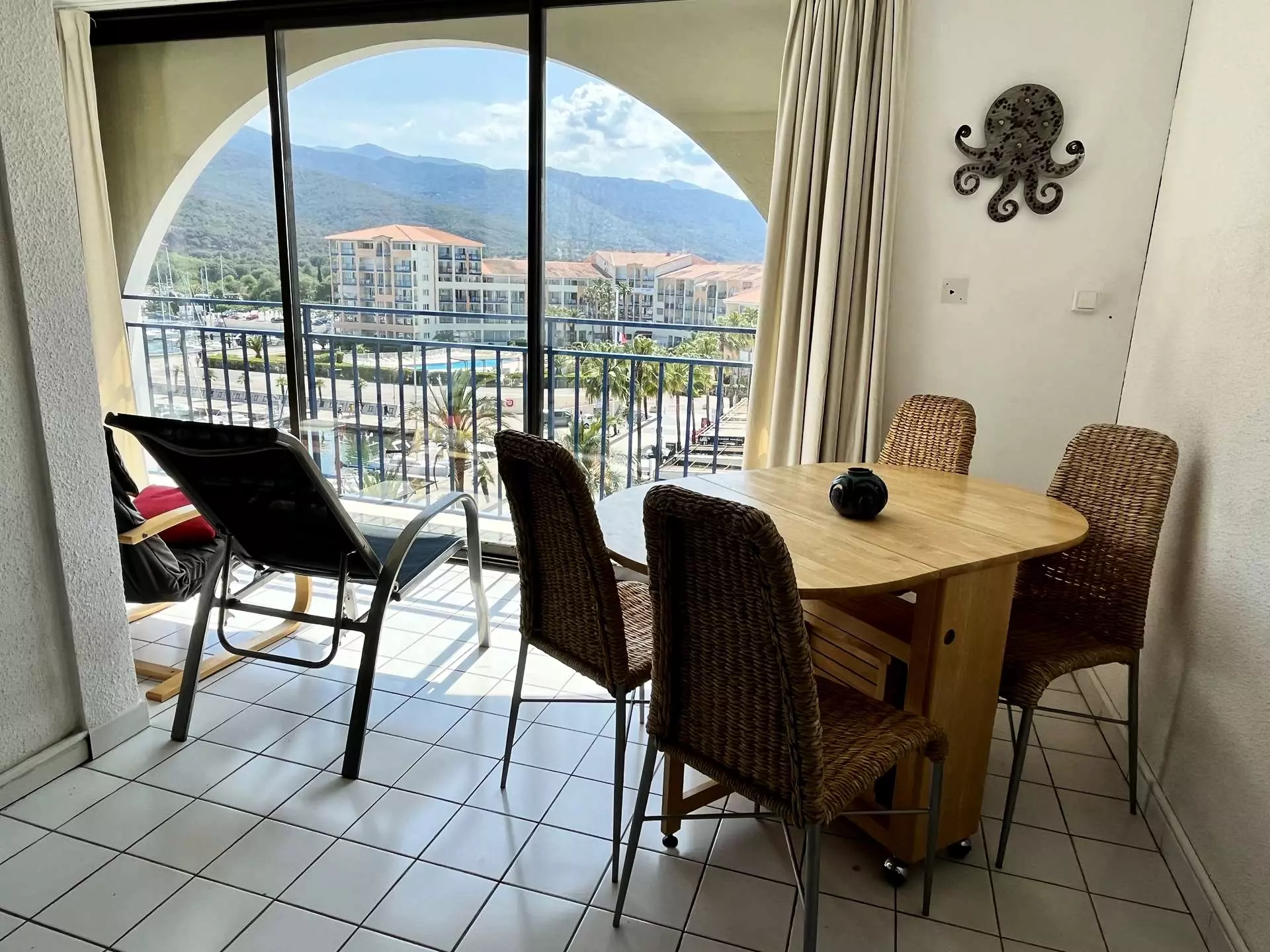 Elle se compose, d'un grand séjour avec un canapé donnant sur une belle vue dégagée sur le Port, une cuisine américaine entièrement équipée.