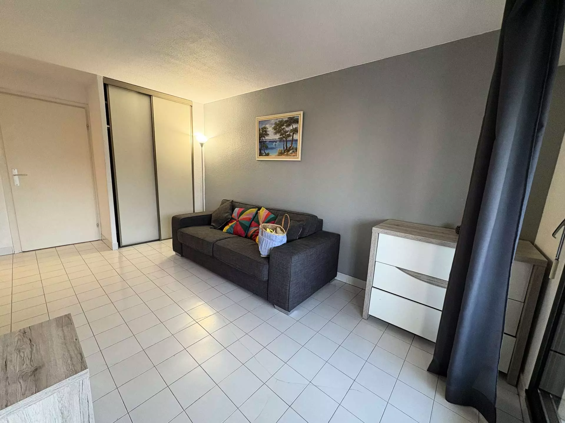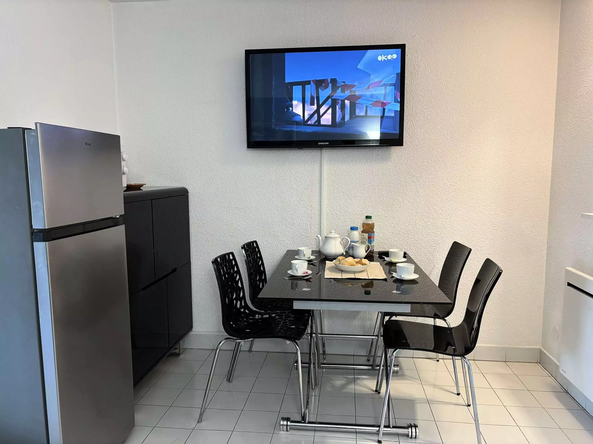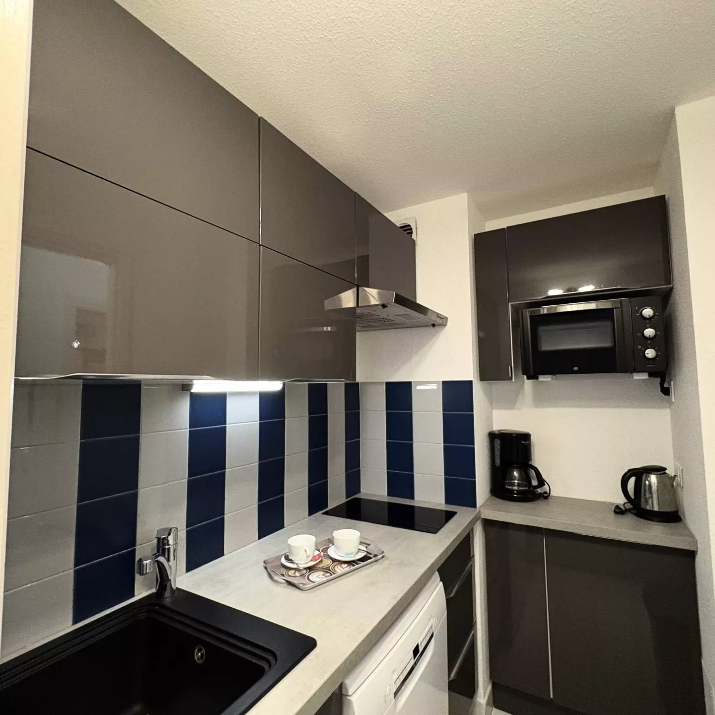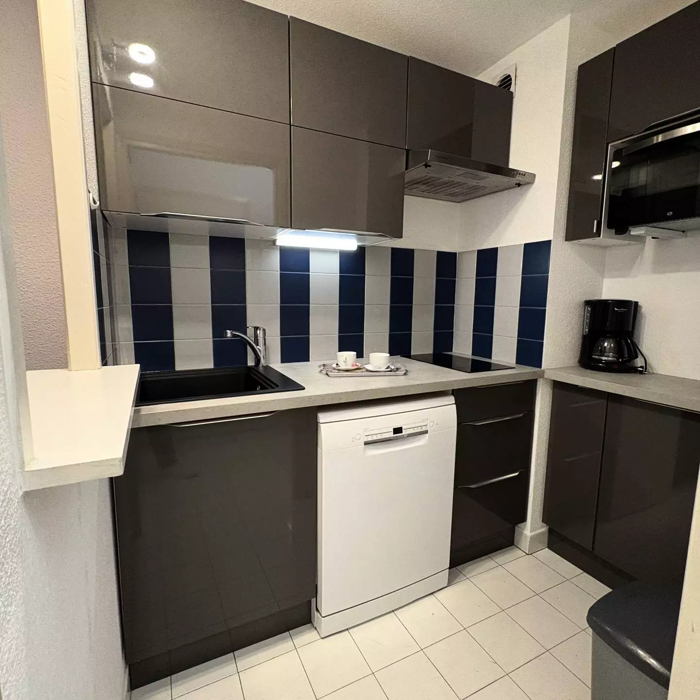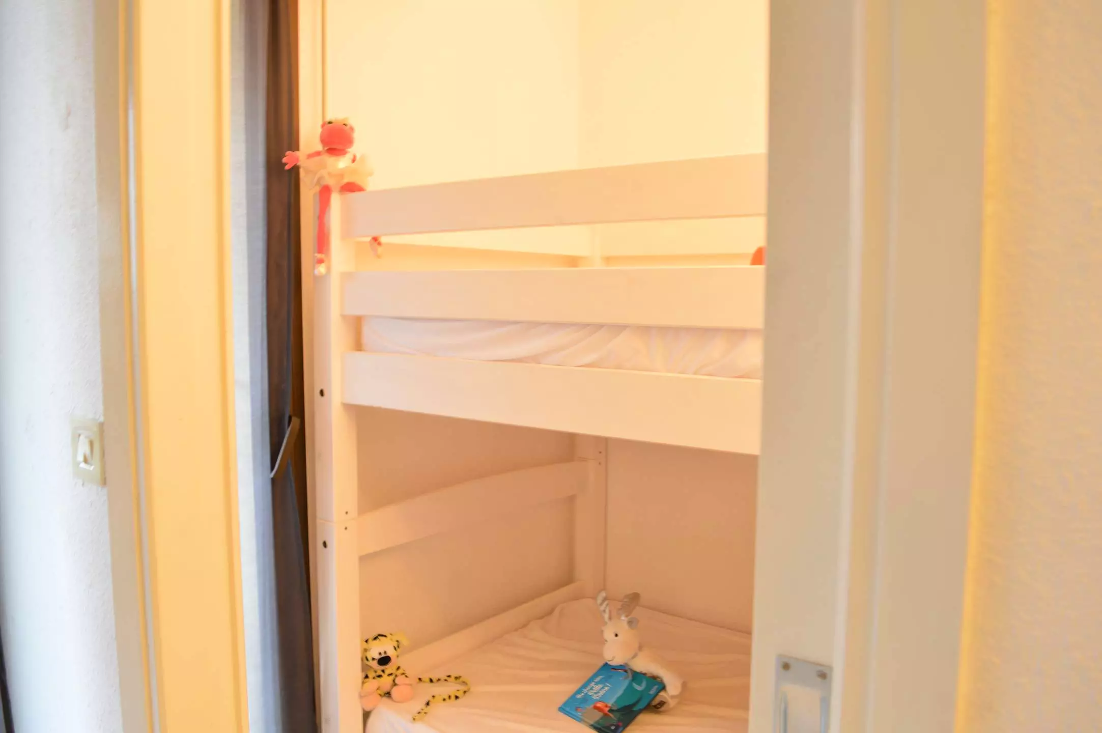Cette location studio vacances située au 3e étage se compose d'une entrée, un séjour avec un canapé lit 2 personnes, , un coin cuisine équipé, une cabine avec lits superposés, une salle de bains et un WC .