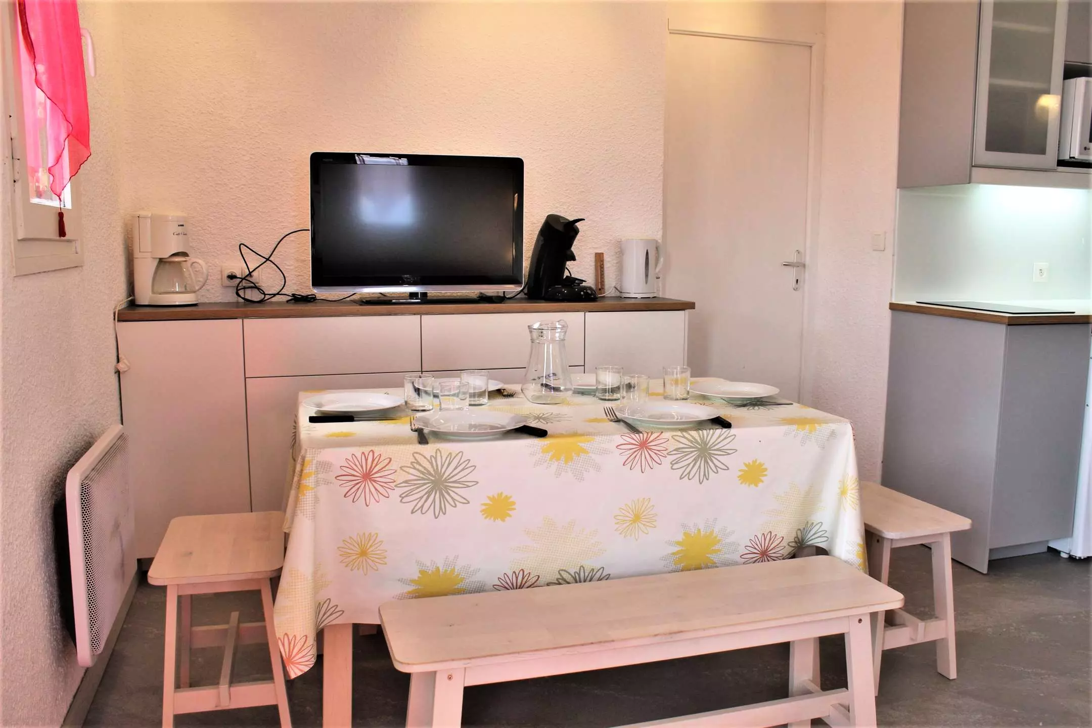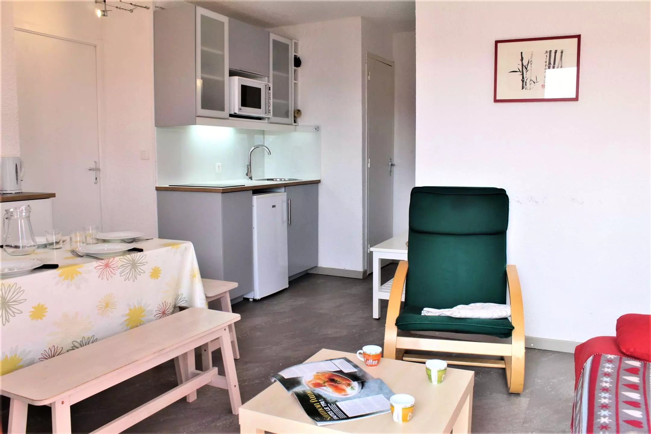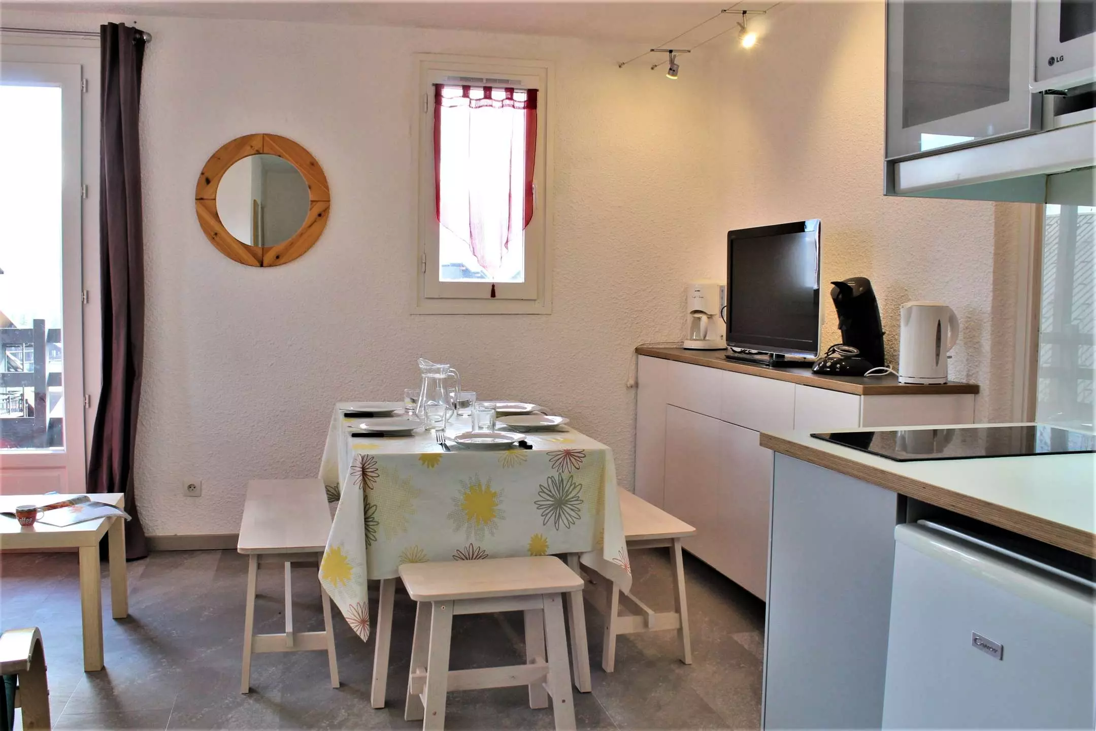 Située au 6ème étage (attention l'ascenseur s'arrête au 5ème), cette location de vacances est composée d'une cabine à l'entrée avec un lit superposé (2 couchages simples), et d'une chambre avec un lit en 140 donnant sur une salle d'eau avec douche. Il comprend également un séjour agréable avec un canapé convertible pour 2 personnes, et une jolie cuisine ouverte. Les WC sont indépendants. L'appartement dispose aussi d'un casier à ski.