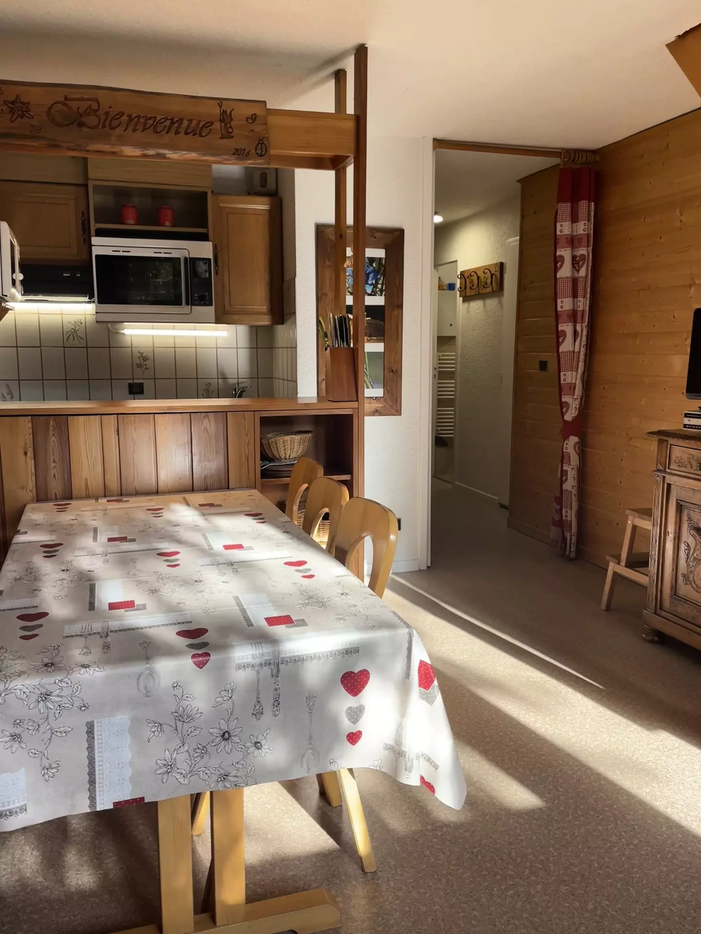 Le séjour comprend un coin cuisine entièrement équipé : micro-ondes, réfrigérateur, lave-vaisselle, four, plaques à induction et hotte aspirante. Lave-linge disponible pour plus de confort. Espace salon avec télévision et connexion Wi-Fi gratuite.