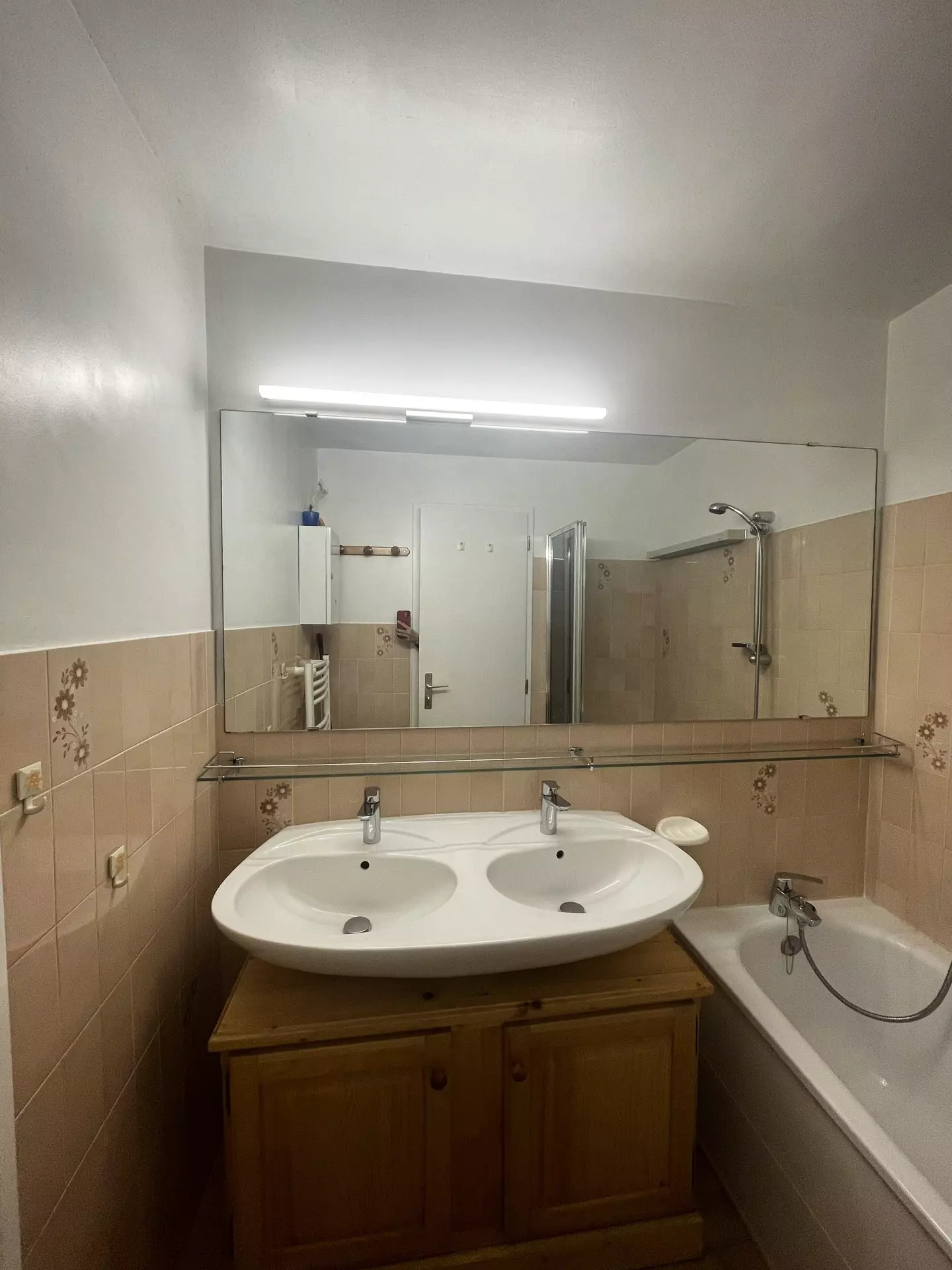 Sanitaires : Salle de bain avec baignoire (rideau de douche), lavabo et sèche-serviettes. WC séparés.
