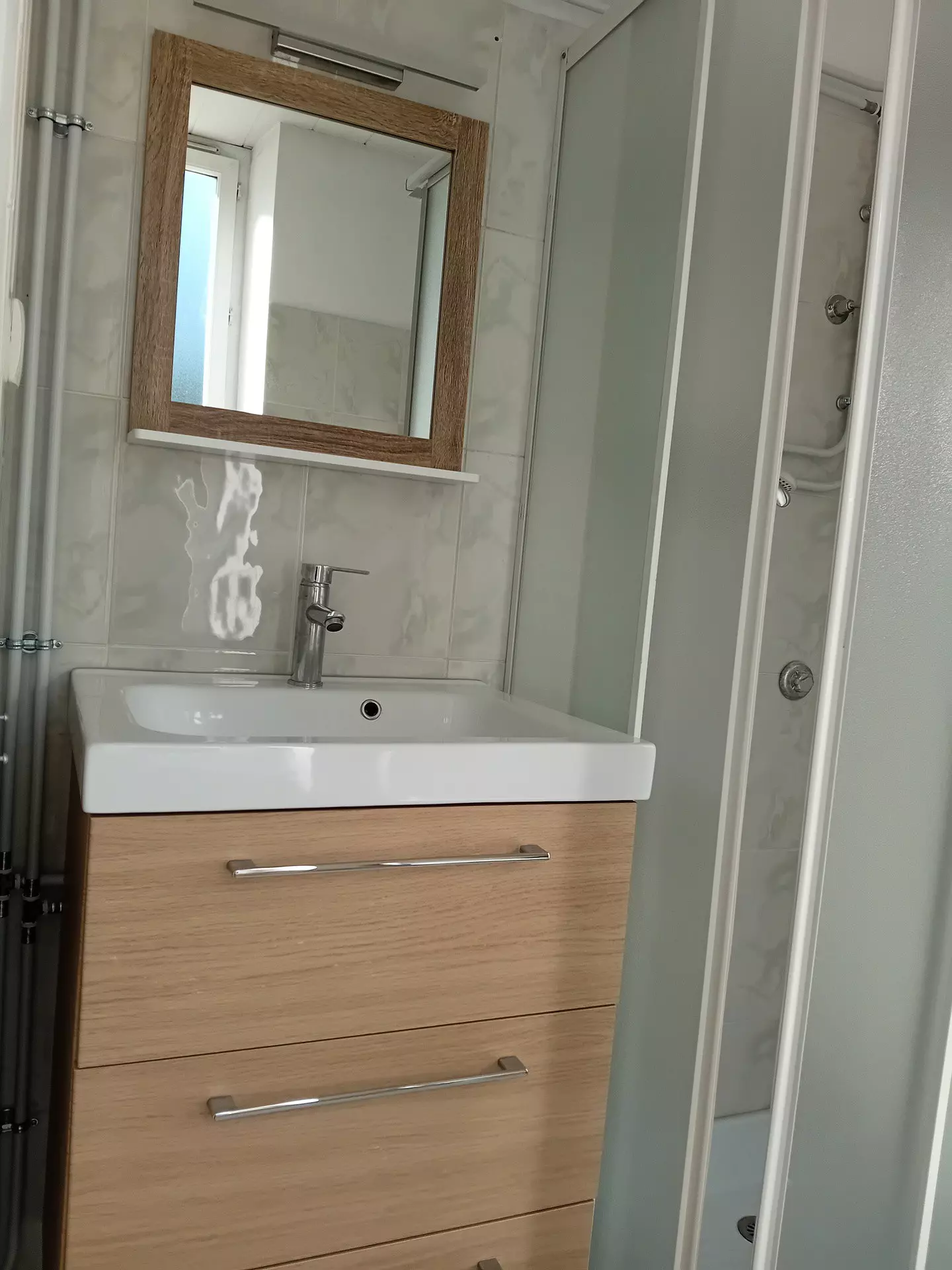 Salle d'eau : cabine de douche, meuble vasque, lave linge, sèche serviette électrique, WC
