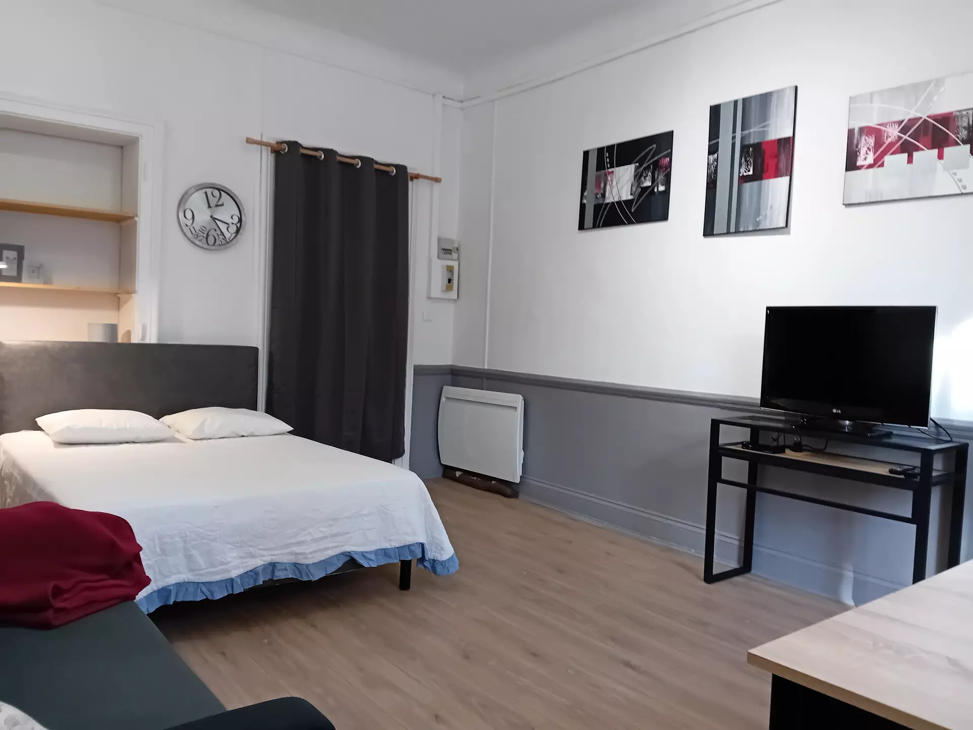 Pièce Principale : 1 clic clac 130cm, 1 commode, 1 chiffonnier, 1 chevet, 2 lampes, 3 placards intégrés (penderie/étagères) 1 table, 2 chaises, 1 télévision.