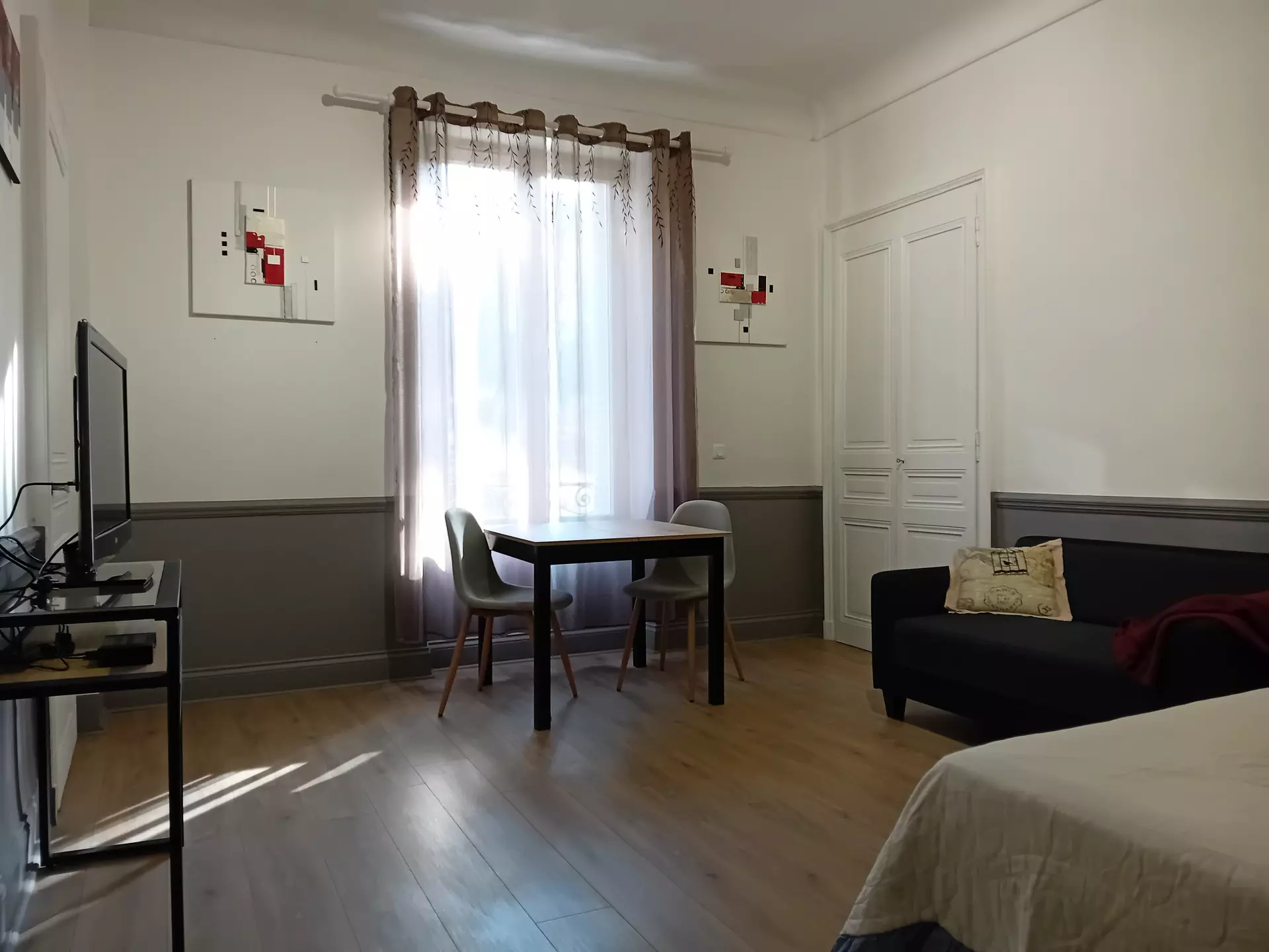 Pièce Principale : 1 literie 140, 1 literie 90cm, 1 table, 2 chaises, 1 télévision écran plat, 1 meuble bas, 1 placard mural.