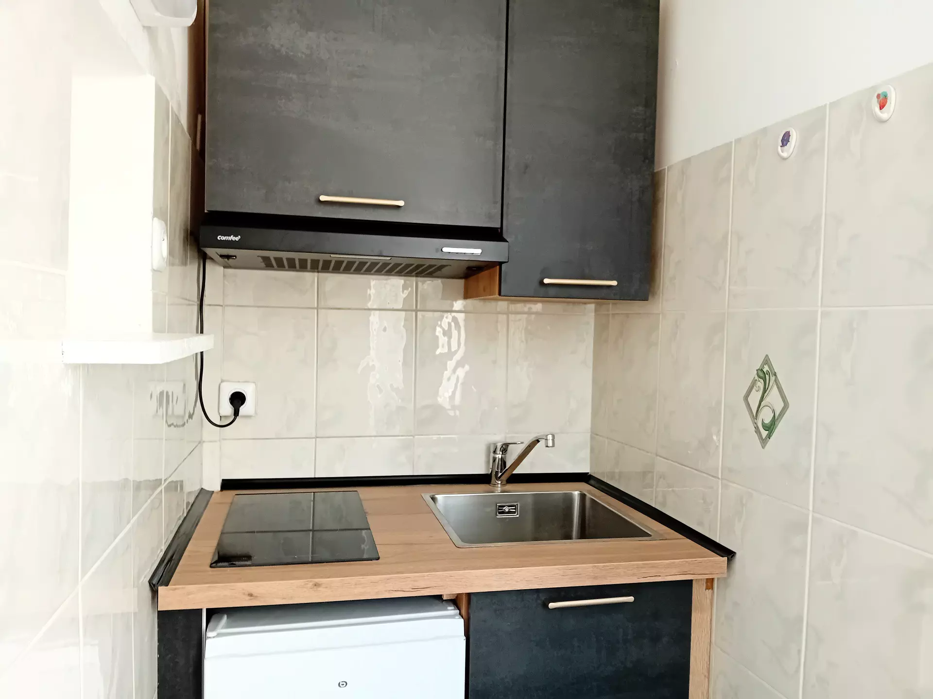 Cuisinette (Sol PVC) : 2 plaques électriques, 1 réfrigérateur/congelateur