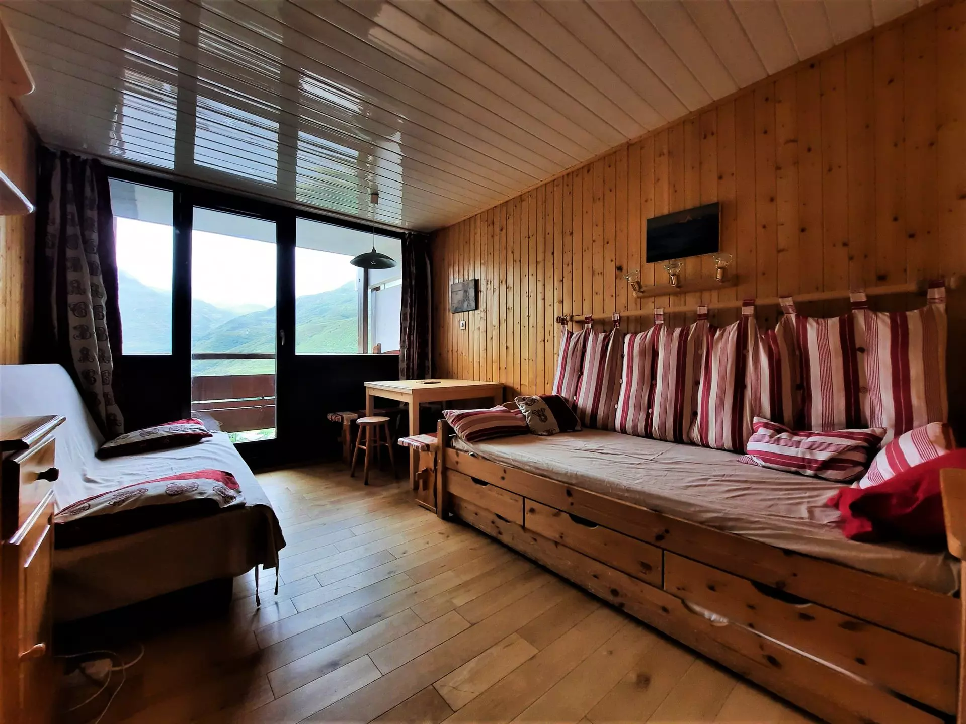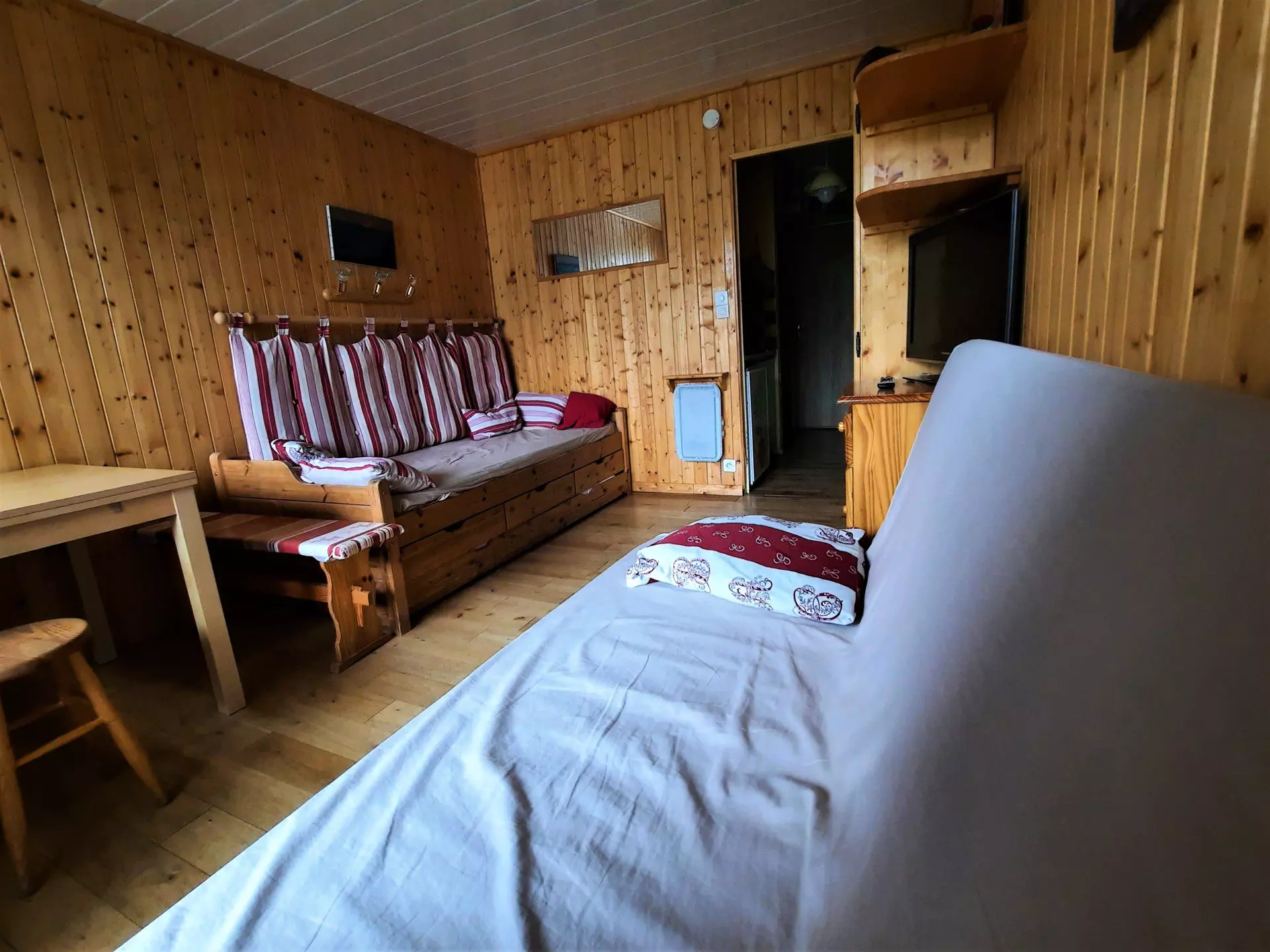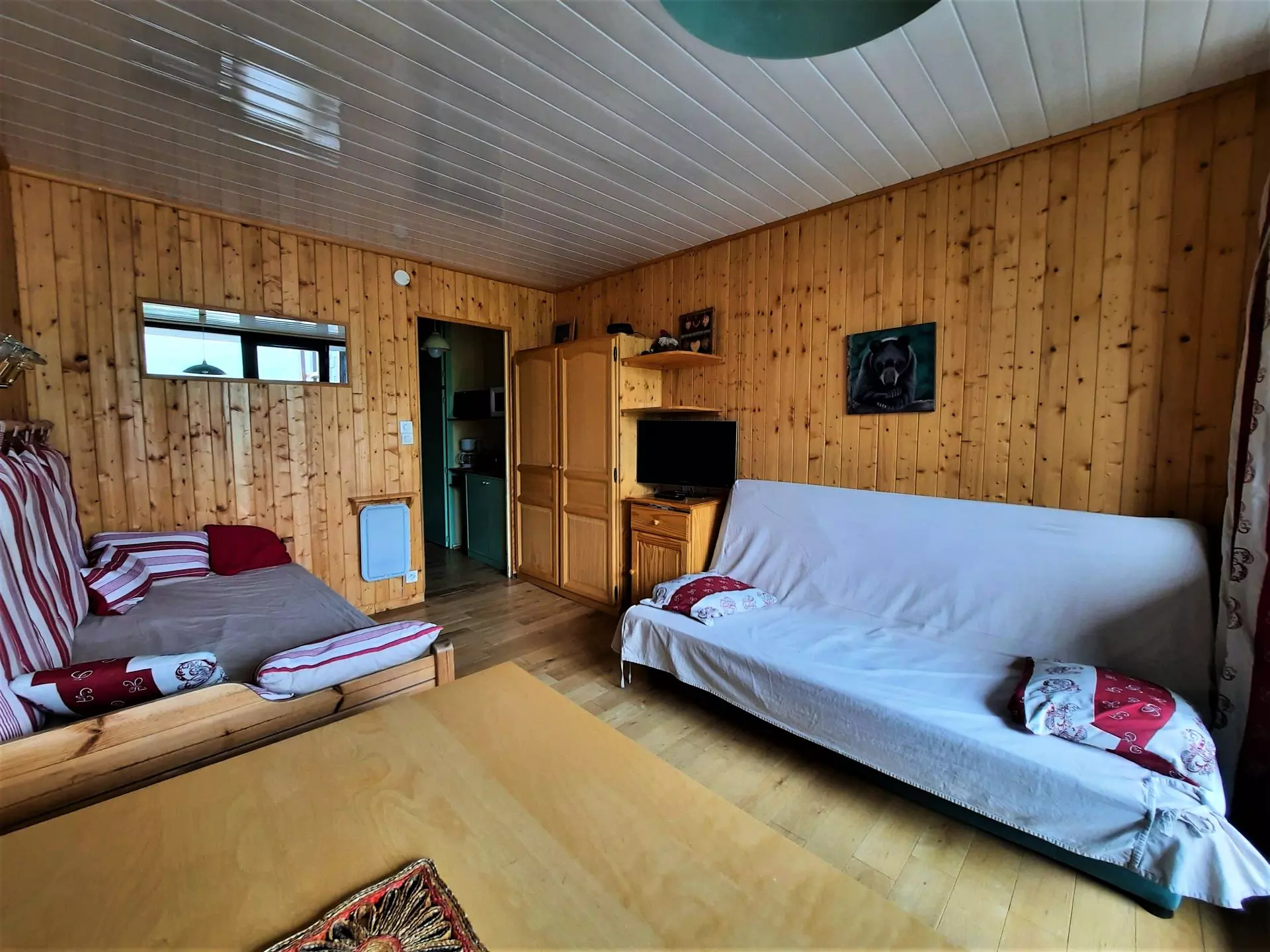 Séjour : banquette-lit simple (80 cm), banquette clic-clac (130cm), télévision écran plat