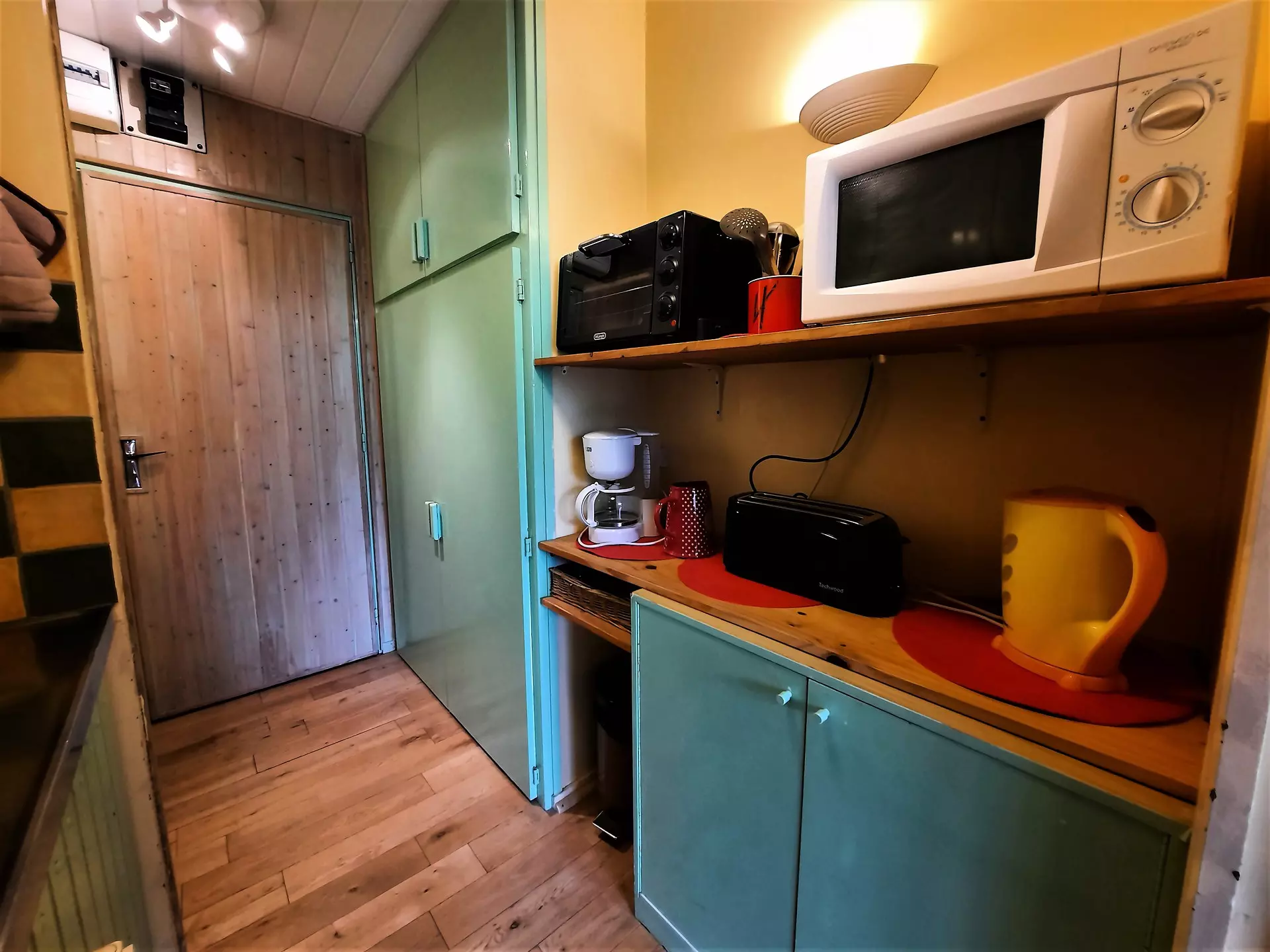 Cuisine : plaques de cuisson vitrocéramiques (x2), mini-four grill, four micro-ondes, réfrigérateur bac à glaçons 5L, cafetière, bouilloire, grille pain, mixeur plongeant