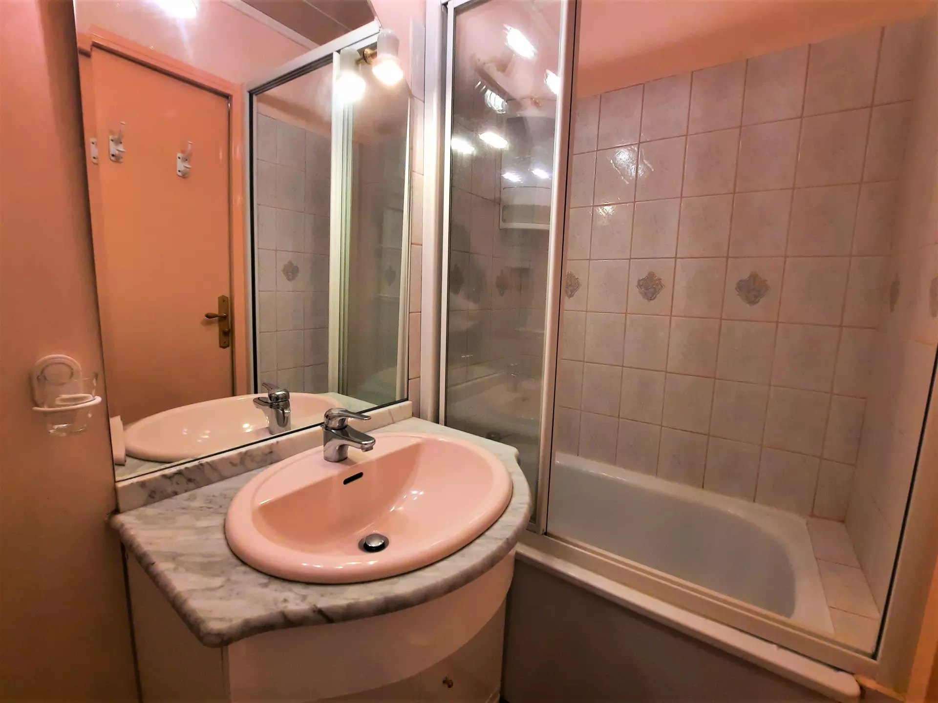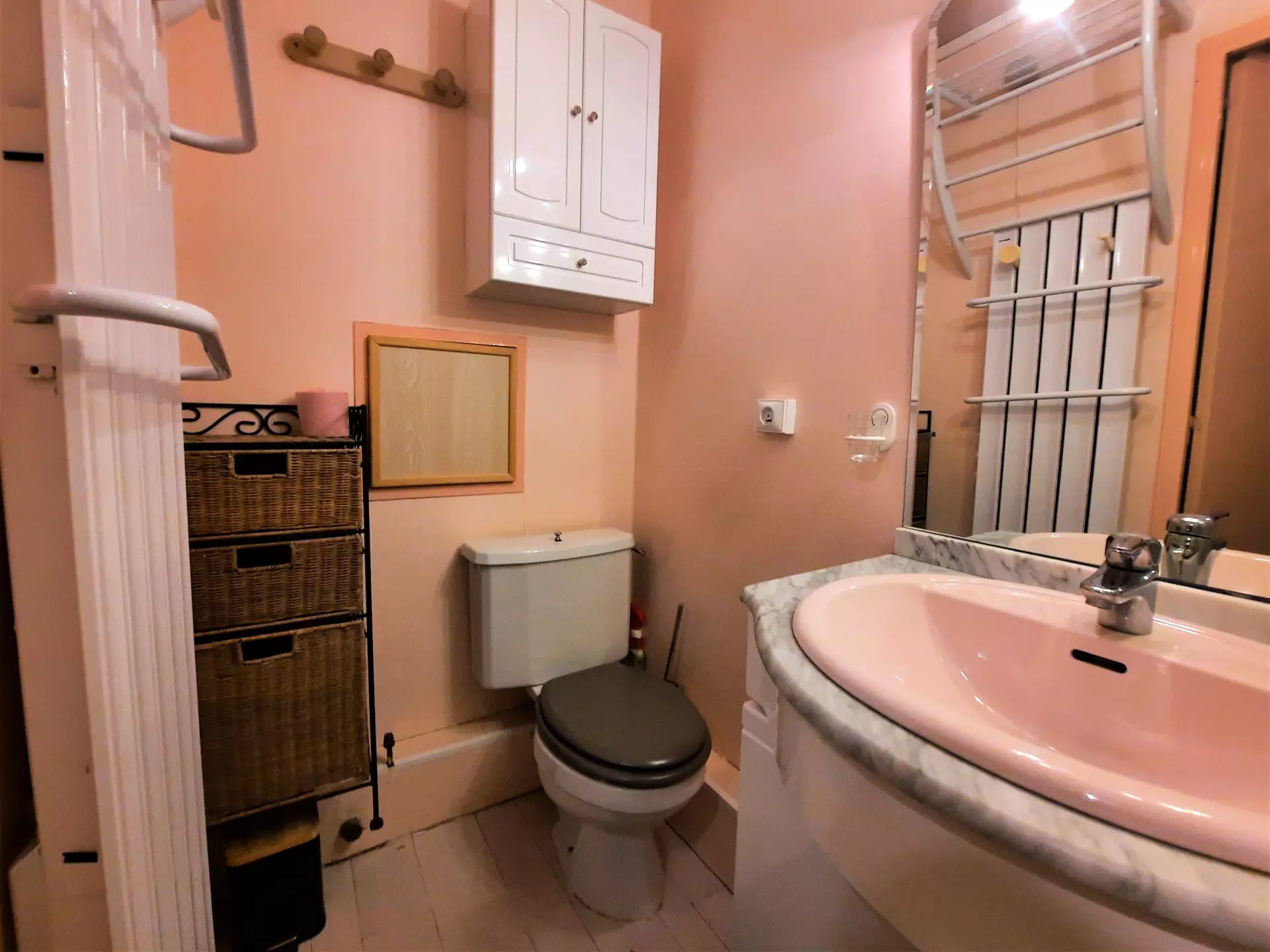 Salle de bain : lavabo, baignoire sabot pare-douche, sèche -serviettes, sèche cheveux, toilettes