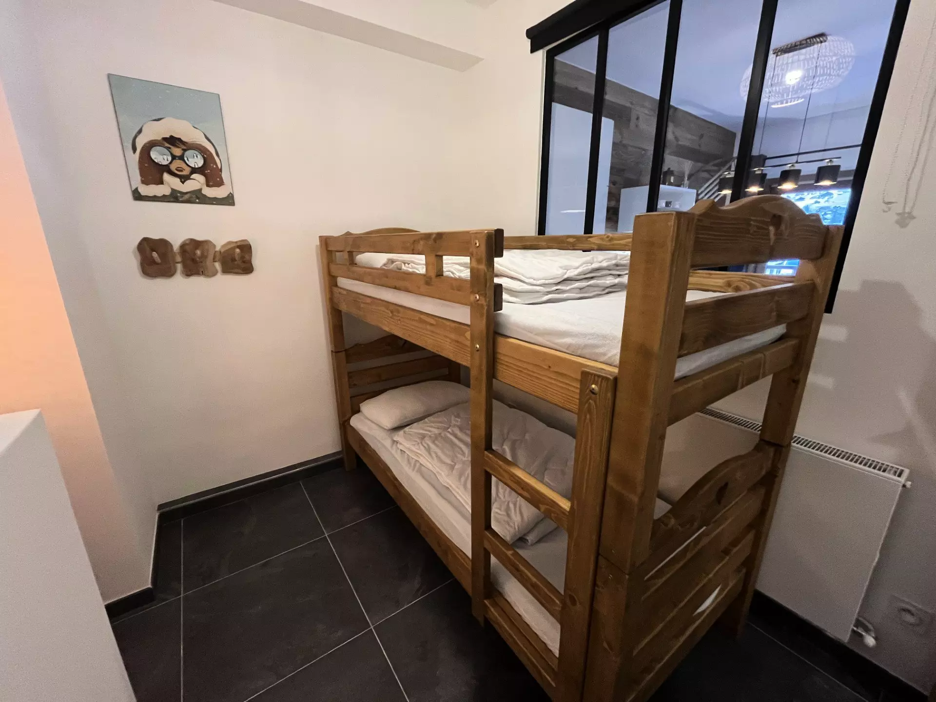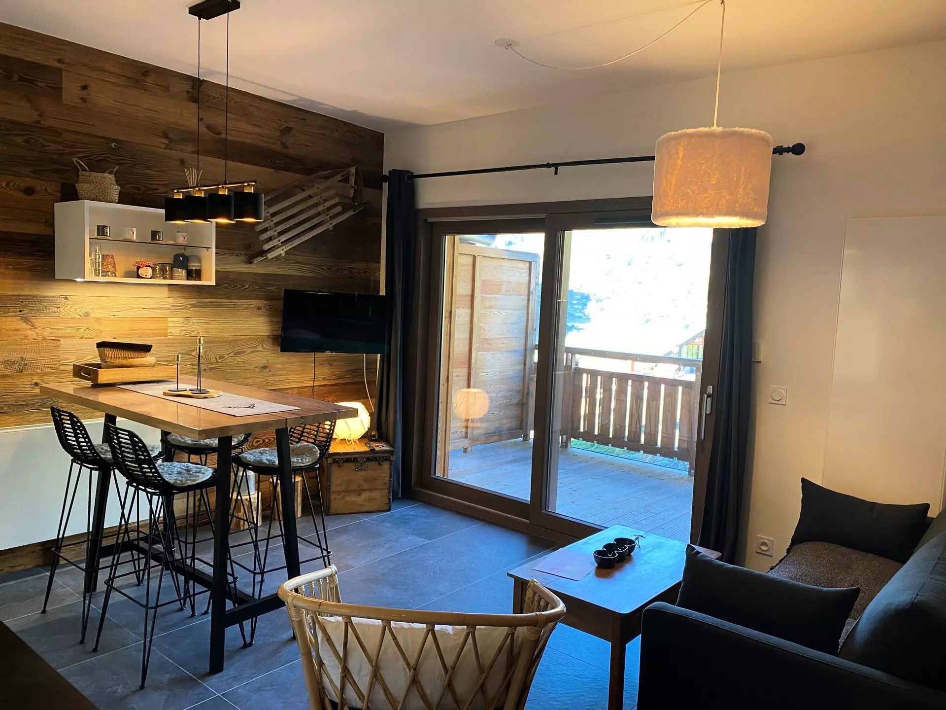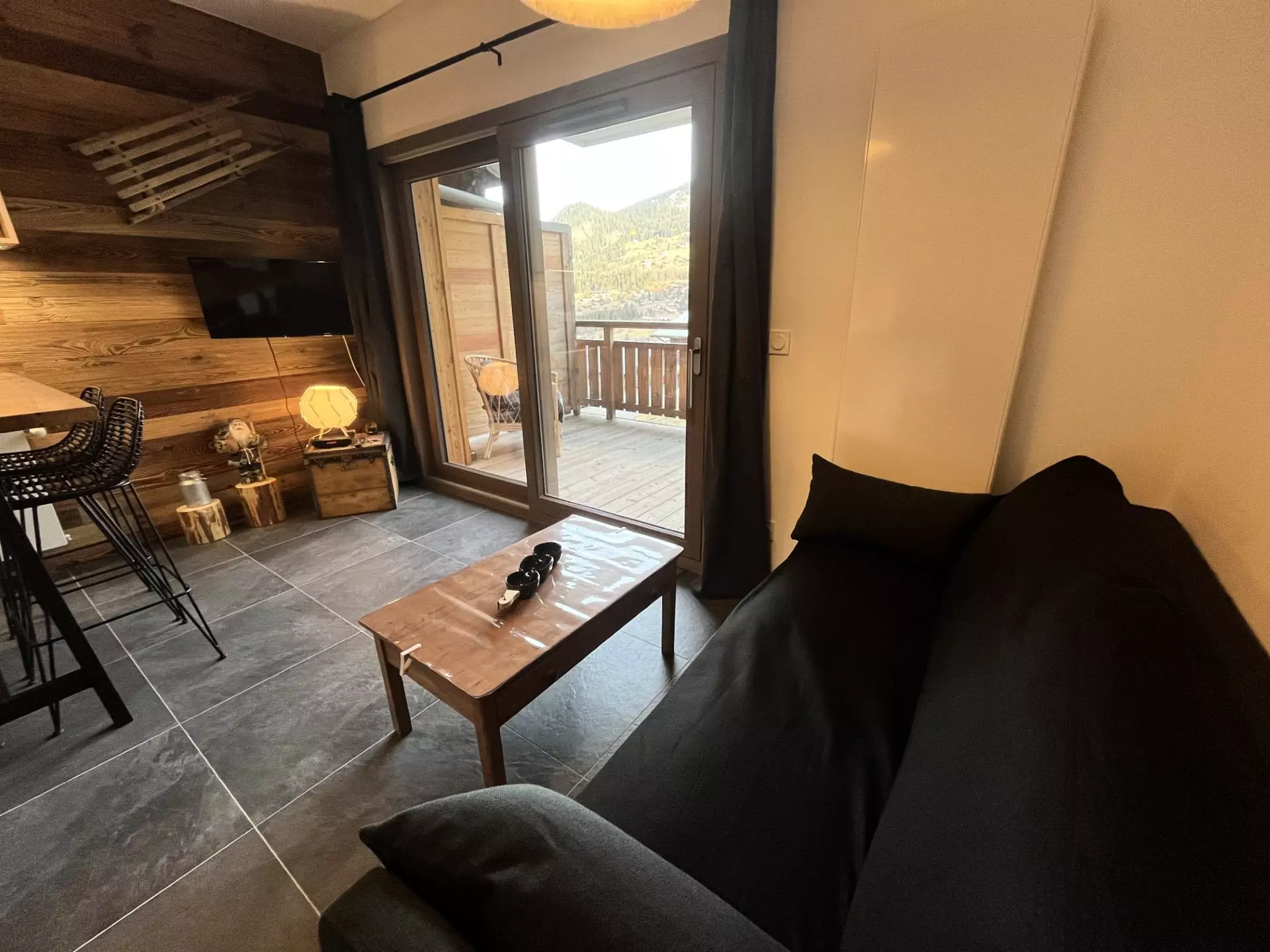Il est composé d'une entrée, un coin cabine avec un lit superposés (90x190) et rangements, une chambre avec lit double (140x190) avec rangements, une cuisine entièrement équipée avec mange debout, salon et une grande terrasse avec vue sur la vallée et mobilier de terrasse.