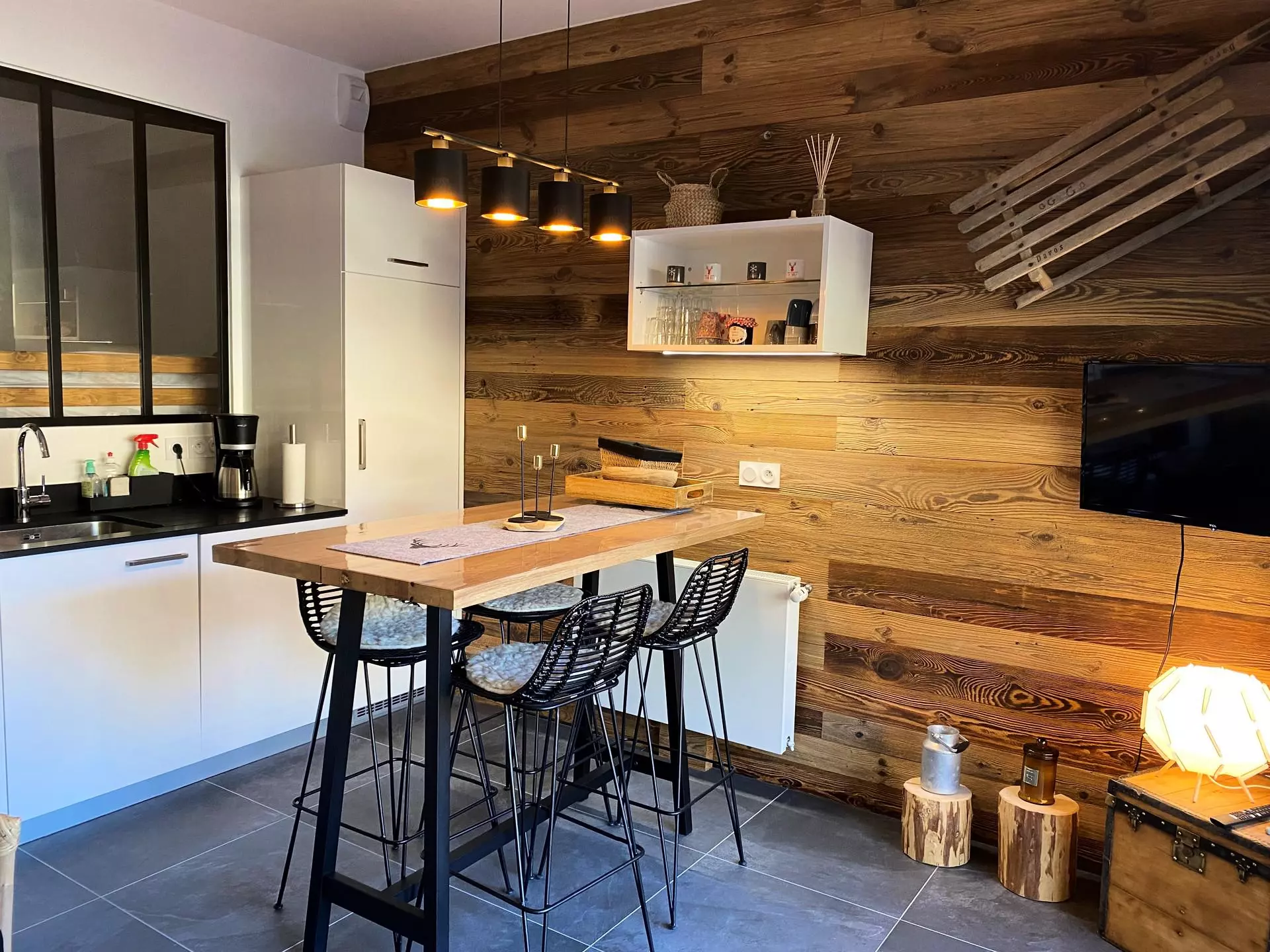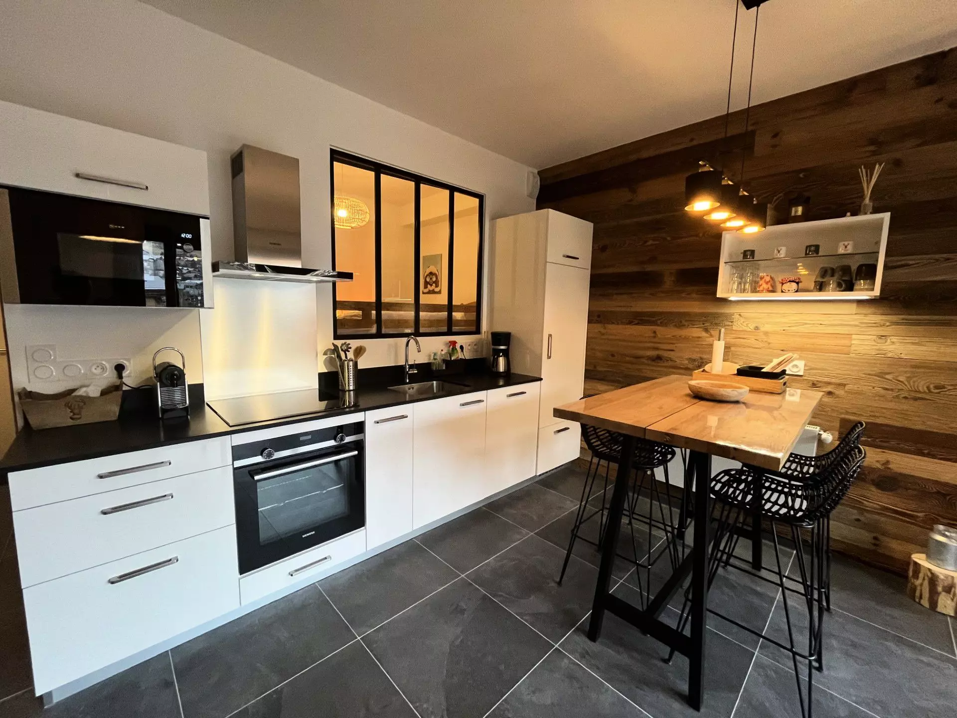 - Lave-vaisselle, four traditionnel, four micro-ondes, réfrigérateur avec congélateur, cafetière Nespresso (capsules non fournies), cafetière à filtres, grille pain, appareil à raclette plancha et grill.