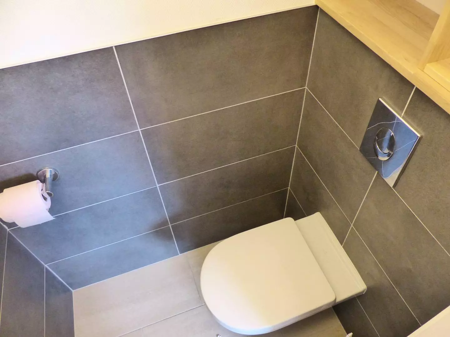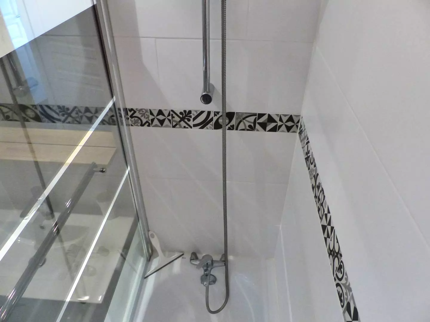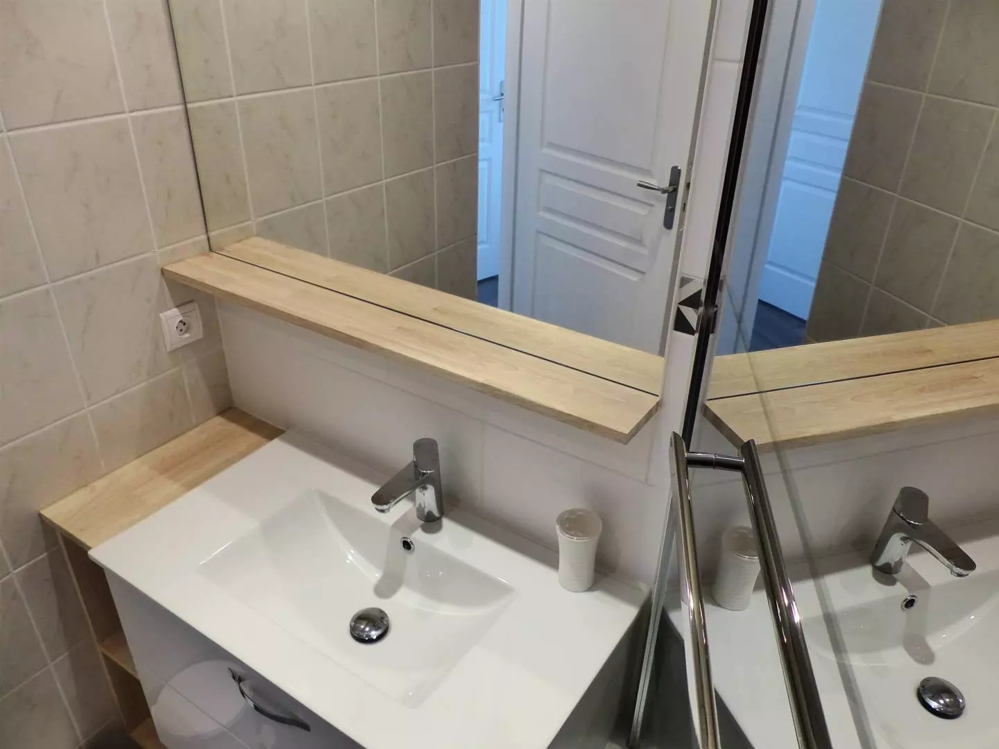 Salle de bains (1.80x1.85): vasque, baignoire et porte-serviettes chauffant. WC suspendus