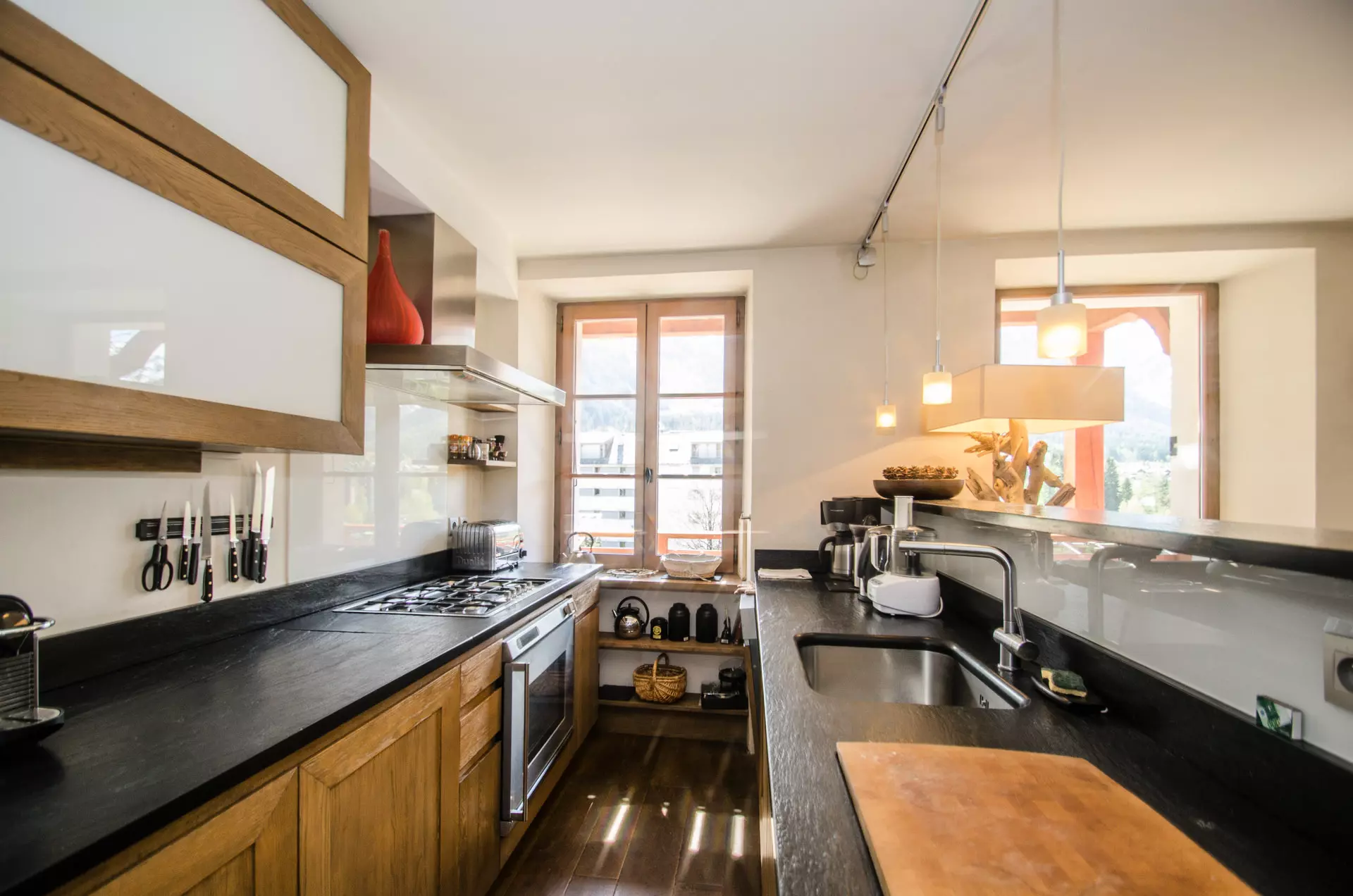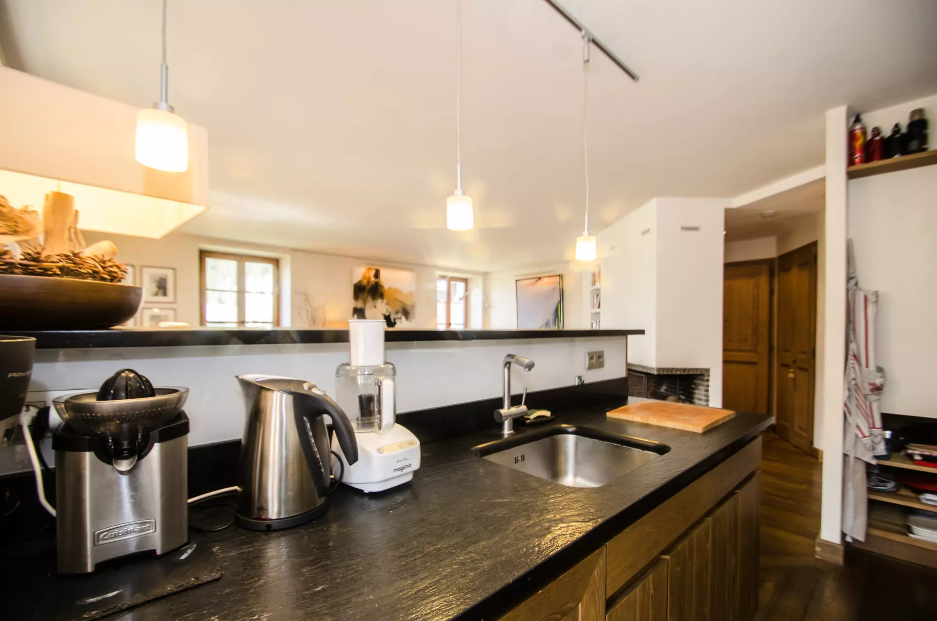 - Cuisine ouverte équipée (plaques gaz, hotte, four, micro-ondes, réfrigérateur, congélateur, lave-vaisselle, grille-pain, bouilloire, cafetière filtre, Nespresso, appareil à raclette, batteur, autocuiseur, mixeur plongeant, presse-agrume électrique, robot hachoir)
