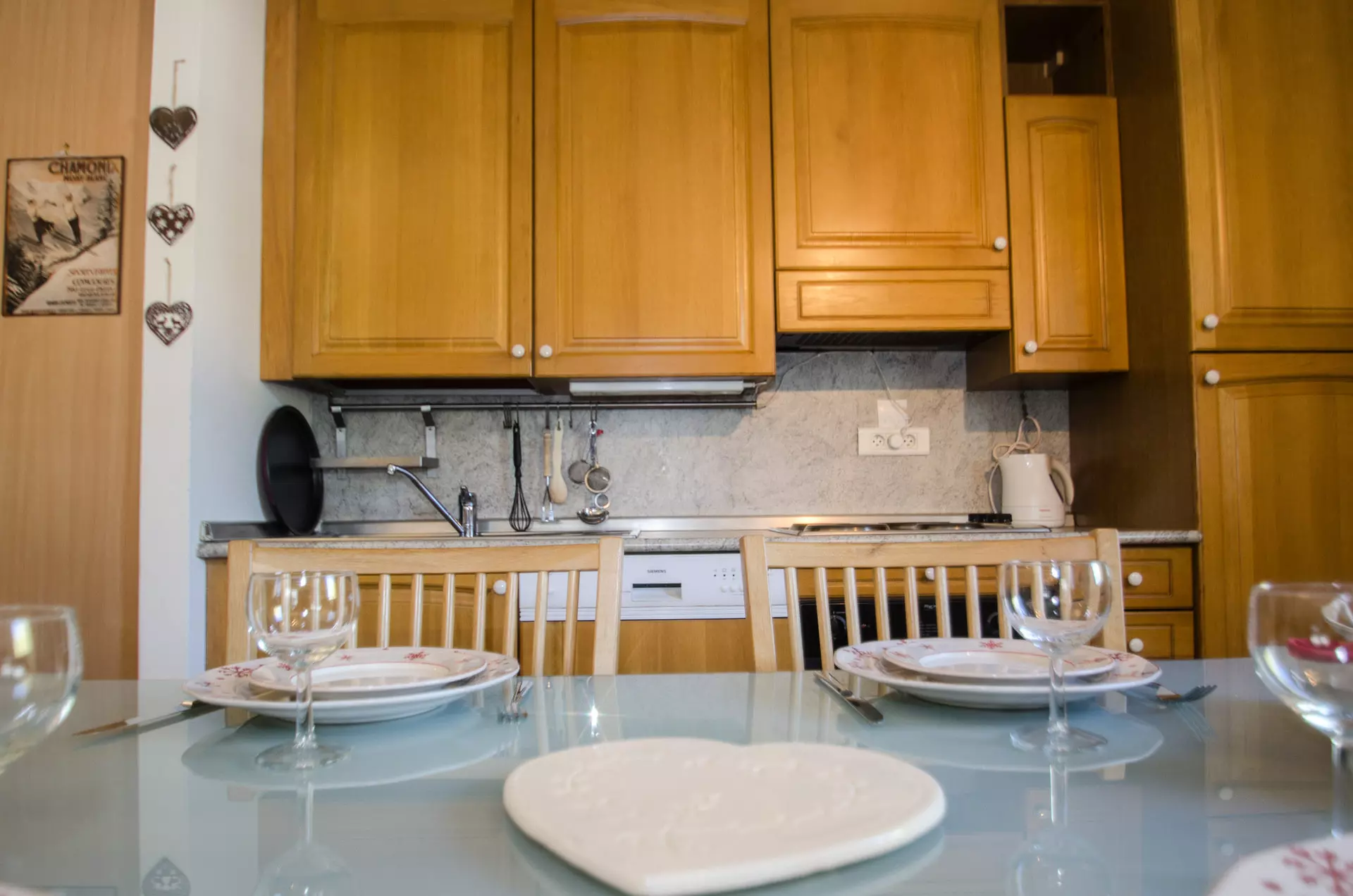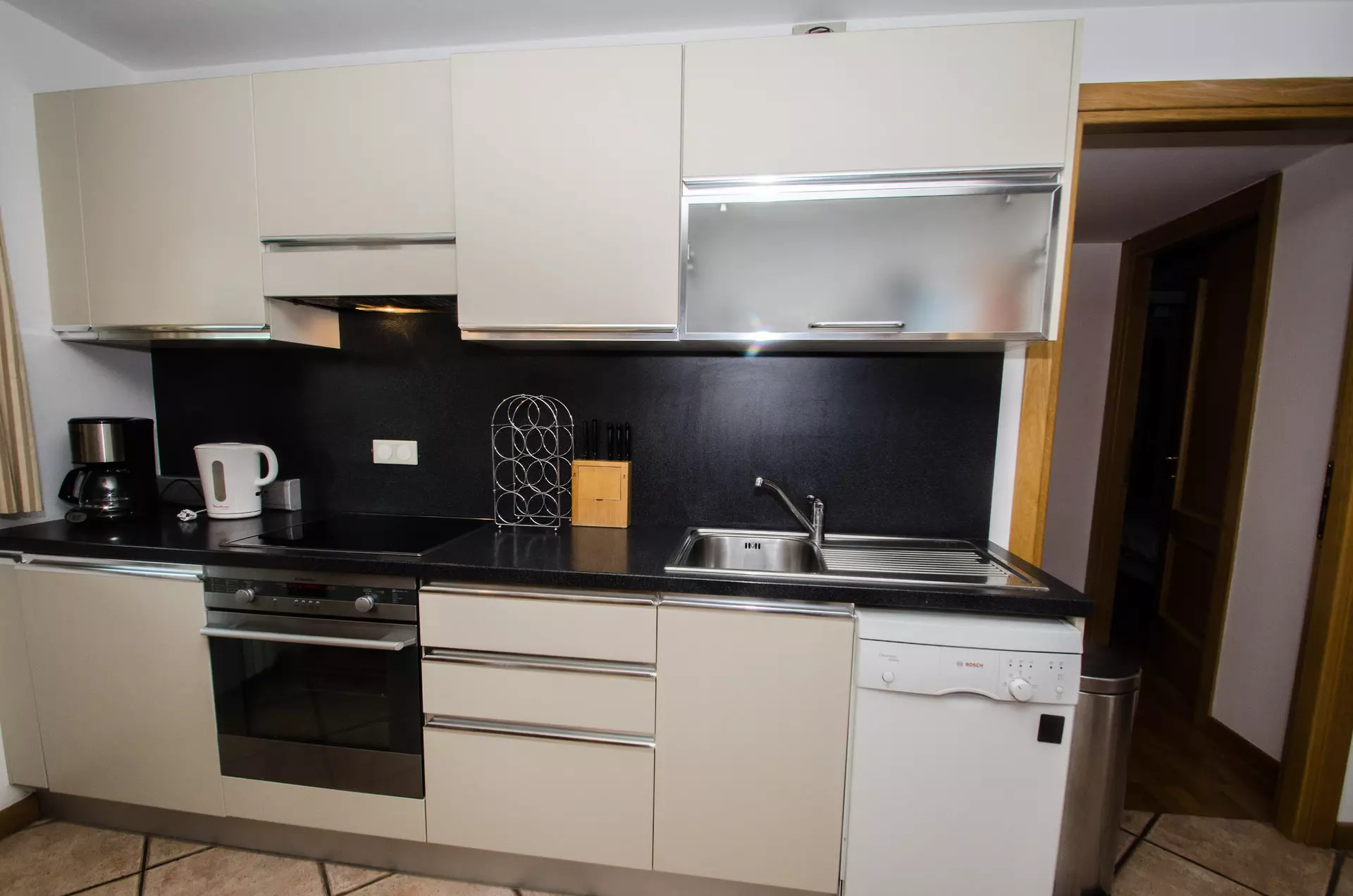 - Coin cuisine équipé (plaque à induction, four, hotte, micro-ondes, réfrigérateur, congélateur et lave-vaisselle, bouilloire, cafetière filtre, grille-pain, robot multifonctions)