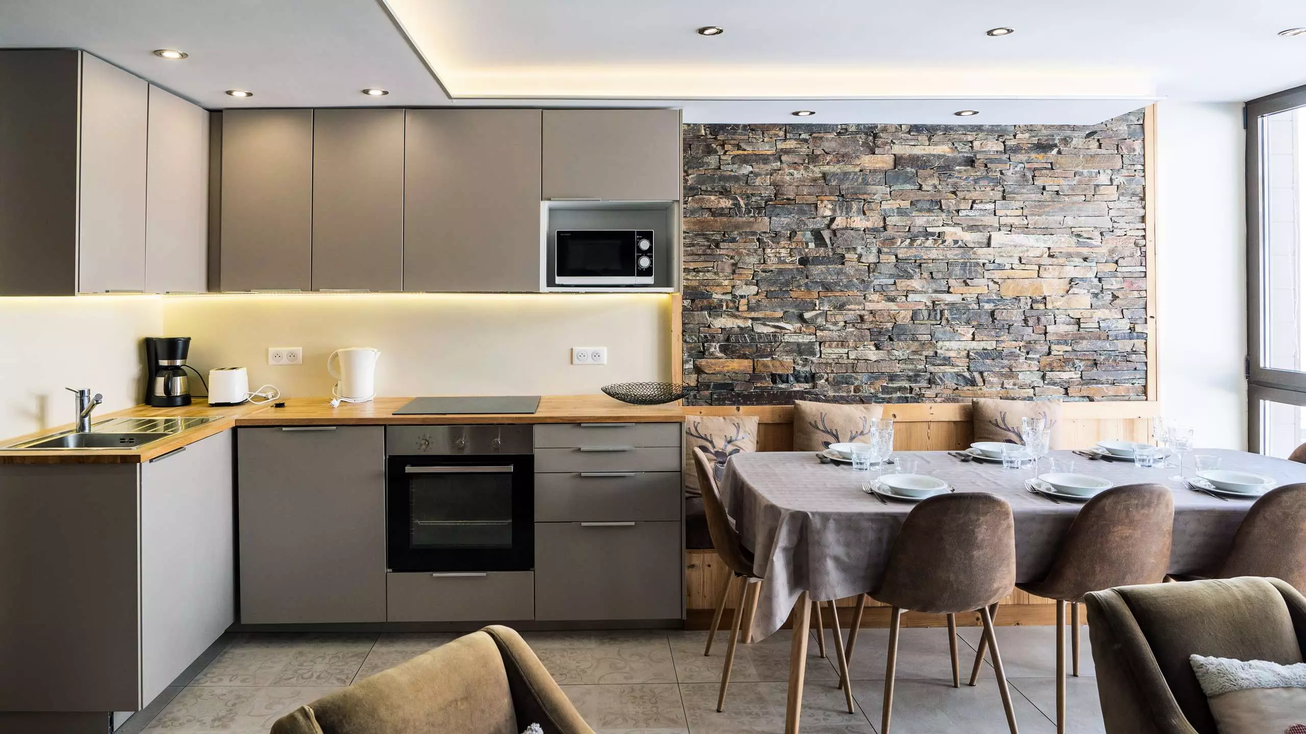 - Cuisine ouverte équipée pour 10 personnes avec plaques à induction, lave-vaisselle, four, micro-ondes, grand réfrigérateur, cafetière et grille-pain.