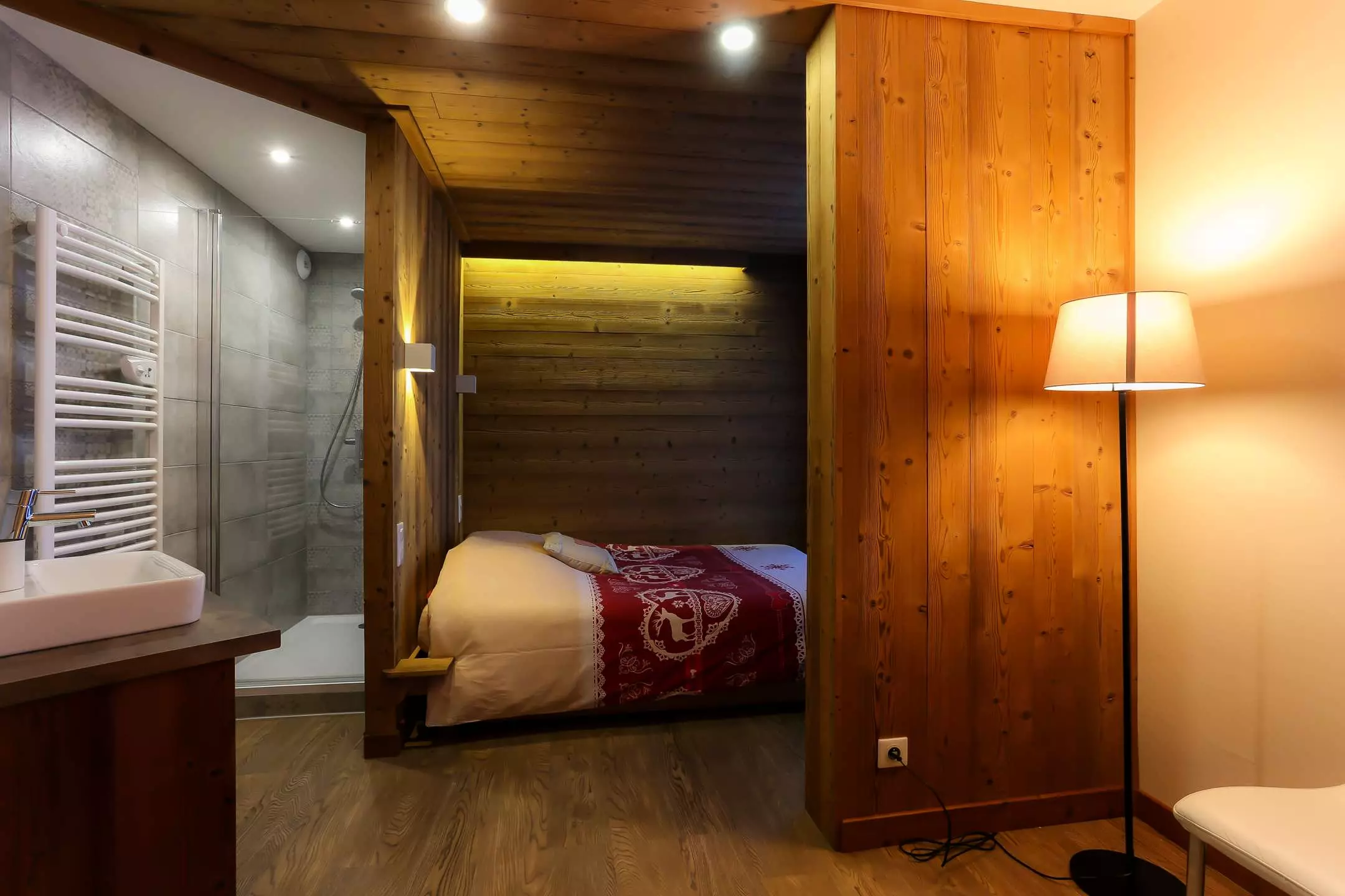 - A l'étage la partie nuit de l'appartement avec quatre chambres. Deux chambres doubles avec leur salle d'eau ouverte. Une chambre double et une grande chambre cabine dortoir avec 2*2 lits superposés. Tous les lits sont équipés de couettes.