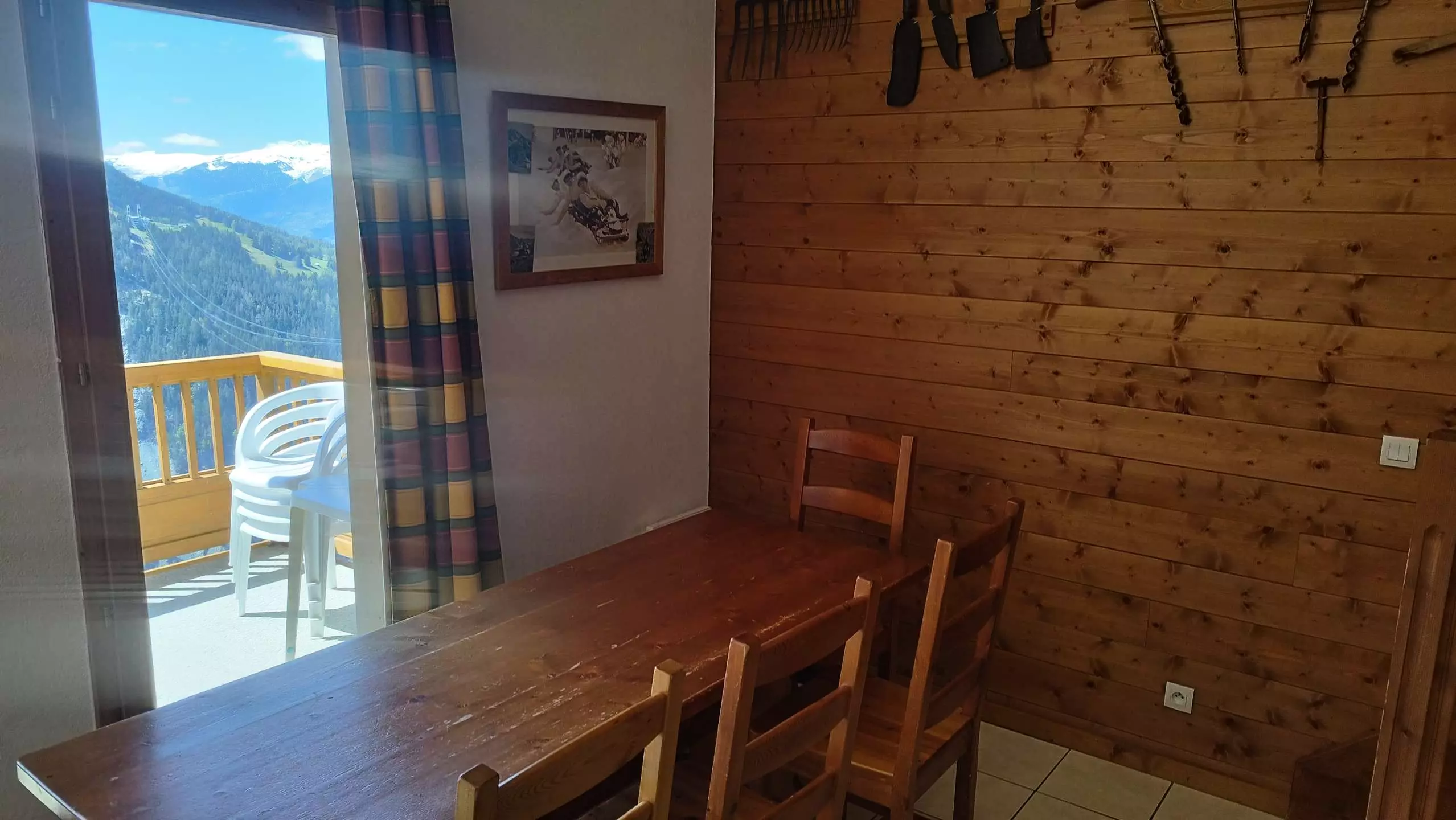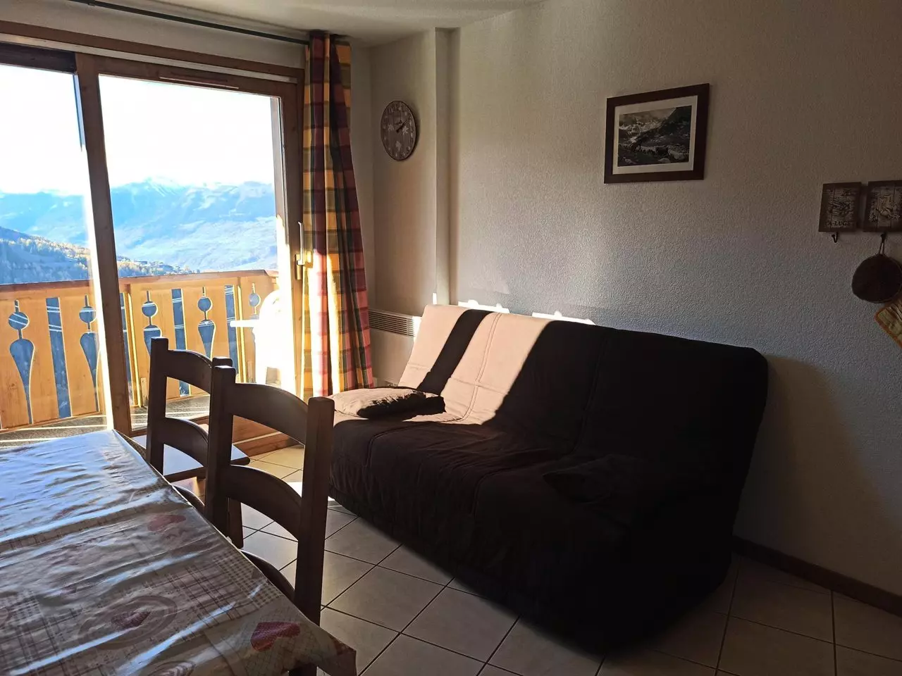 Appartement de 70m2 : 4 chambres dont 1 avec lit double, 1 avec 2 lits simples et 2 avec 2 lits superposés , 1 salle de douche + 1 salle de bain, WC séparé, séjour avec 2 couchages simples et cuisine équipée donnant sur 1 large balcon avec table et chaises, offrant une belle vue vallée. La résidence est à proximité des pistes.