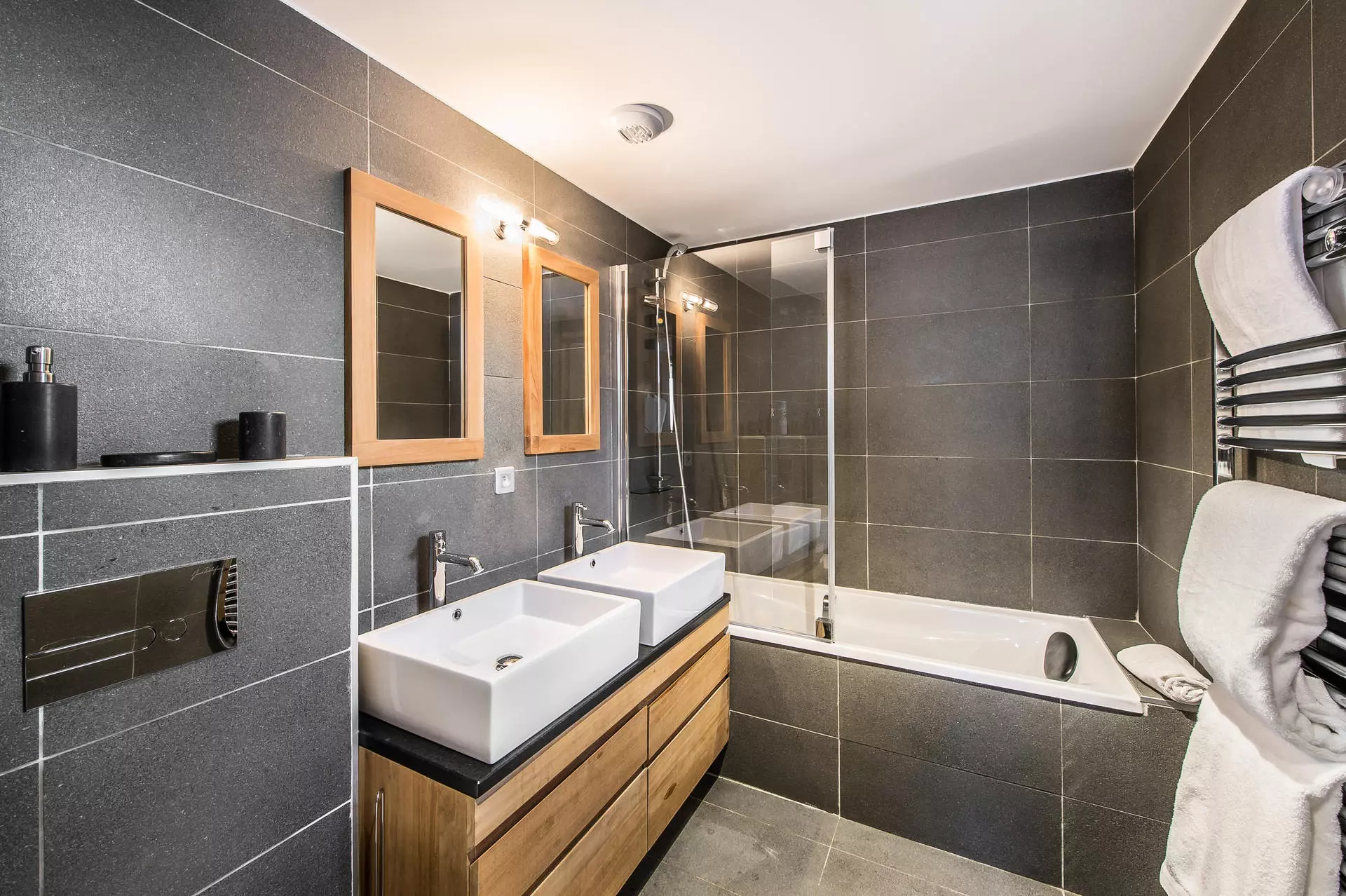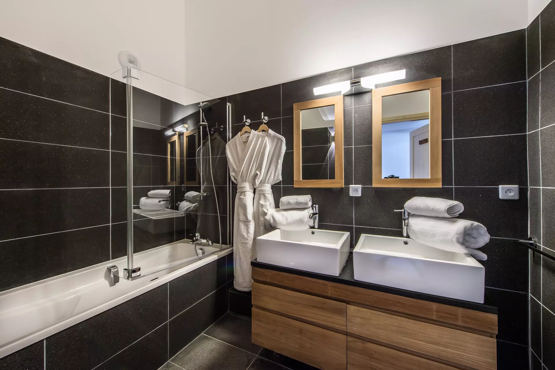 - Une salle de bain avec baignoire, double vasques