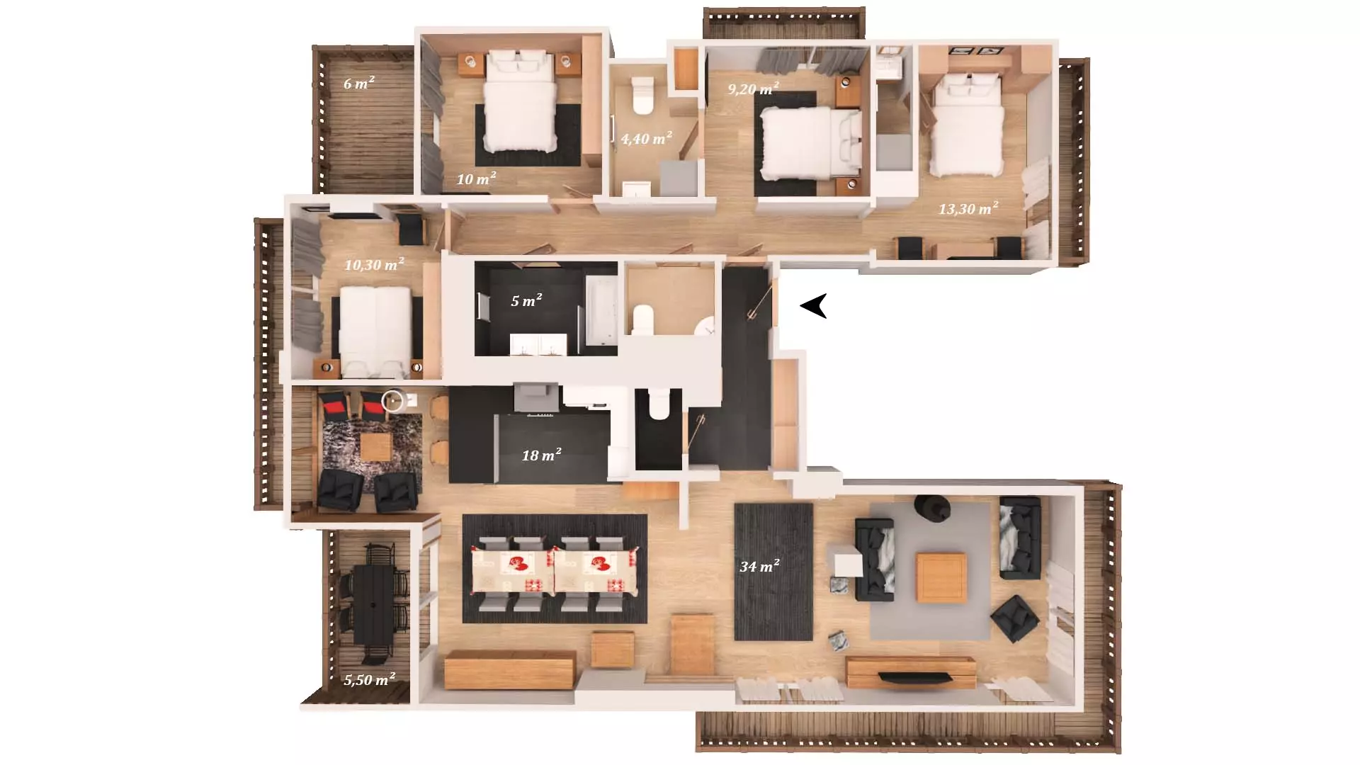 Magnifique appartement T5 en duplex situé au 3ème étage de la Résidence ASPEN LODGE, bâtiment A, dans le centre de Courchevel Moriond.