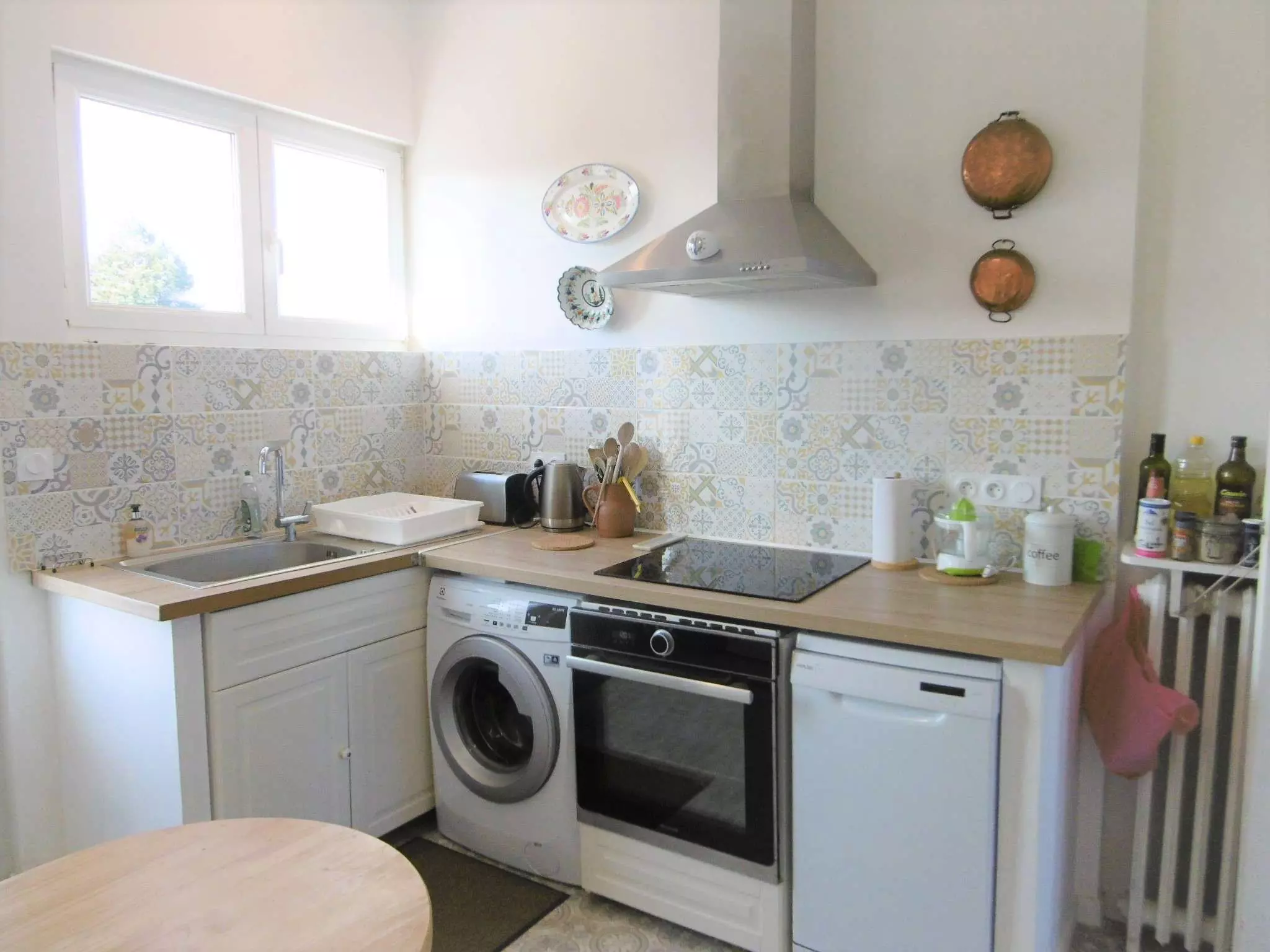 Équipement : réfrigérateur avec partie congélateur, four, micro-ondes, table de cuisson vitrocéramique, lave-vaisselle, lave-linge, cafetière, grille-pain, TV.