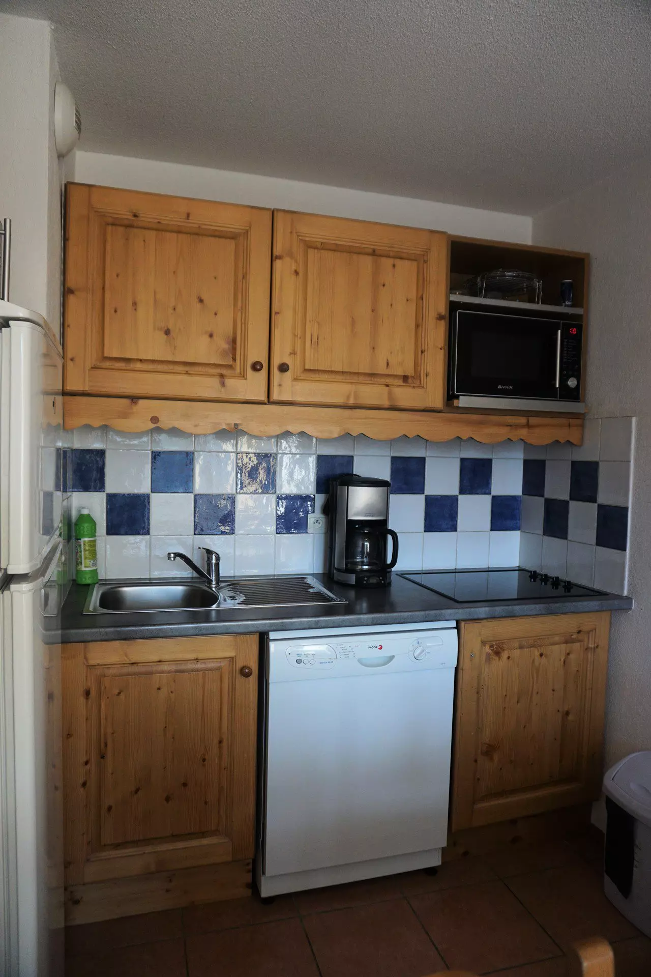 Coin cuisine : 4 plaques vitro-céramiques, frigo/congélateur, micro-ondes, lave-vaisselle.